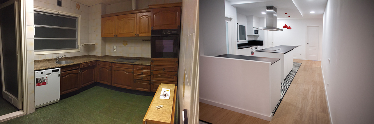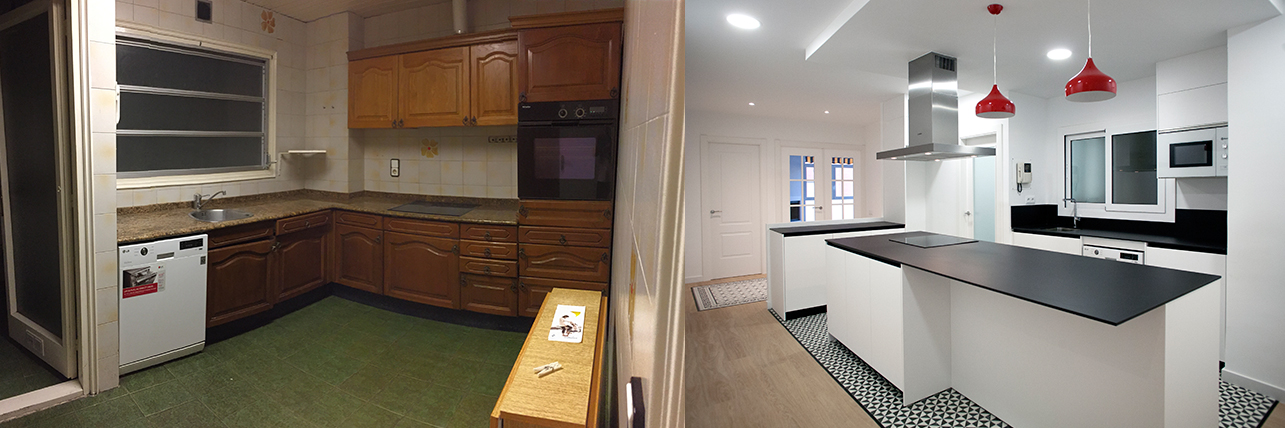 Uno de los cambios más impactantes en esta reforma integral es el de la cocina. Antes, la cocina ocupaba una estancia propia y lucía una imagen de antaño, con azulejos con motivos florales o armarios con acabados en madera.