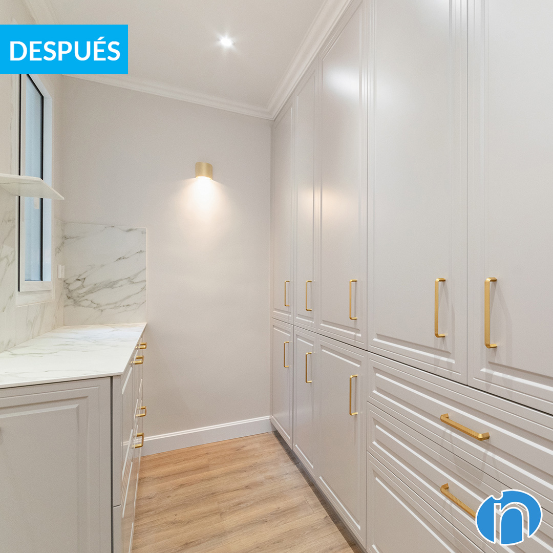 La nueva cocina mejora con creces la anterior. Es amplia, ofrece gran superficie de apoyo y está equipada por completo. A su vez, también hemos instalado una isla de cocina que amplia la superficie de trabajo y el almacenaje. Todo ello expuesto en un diseño interior clásico en tonalidades neutras.