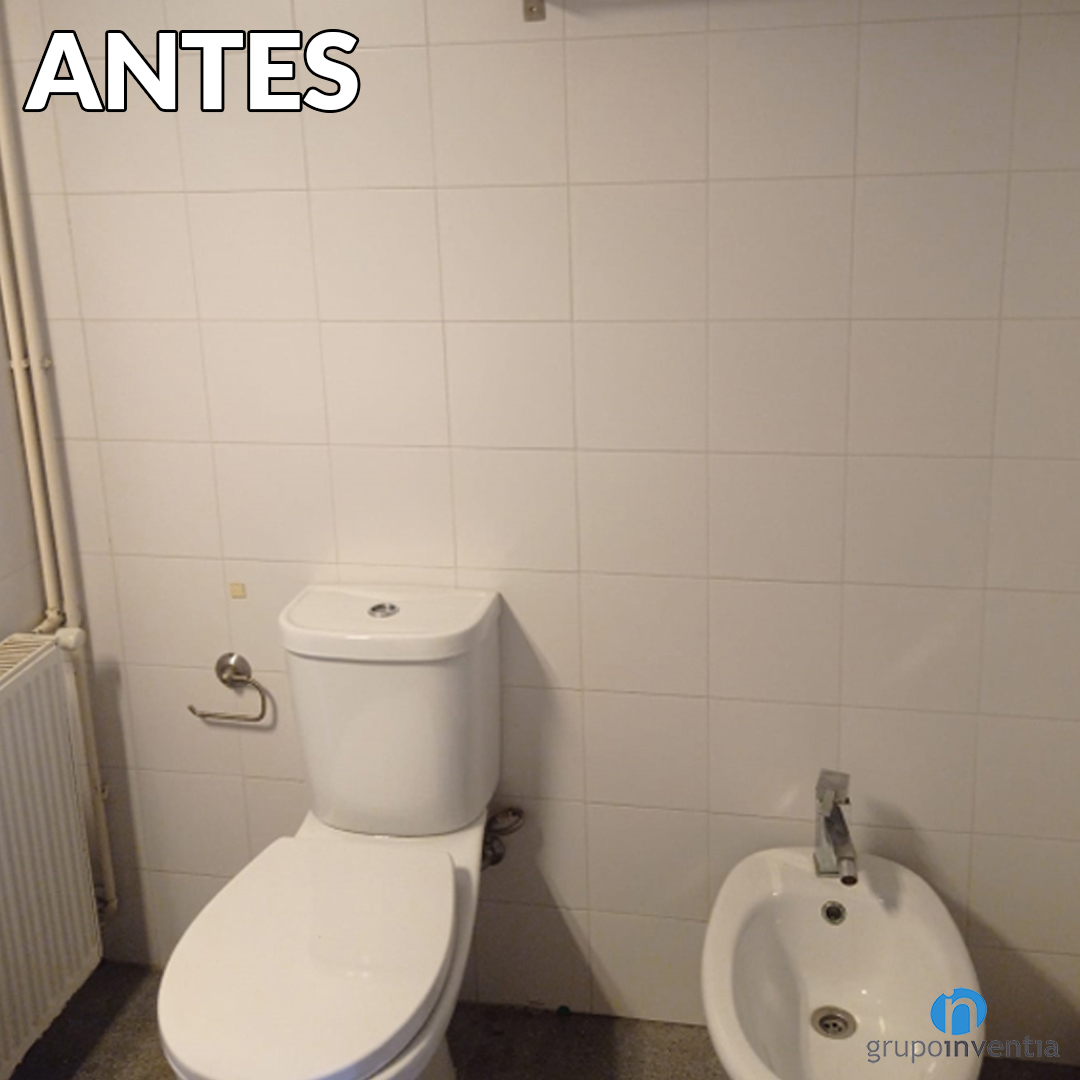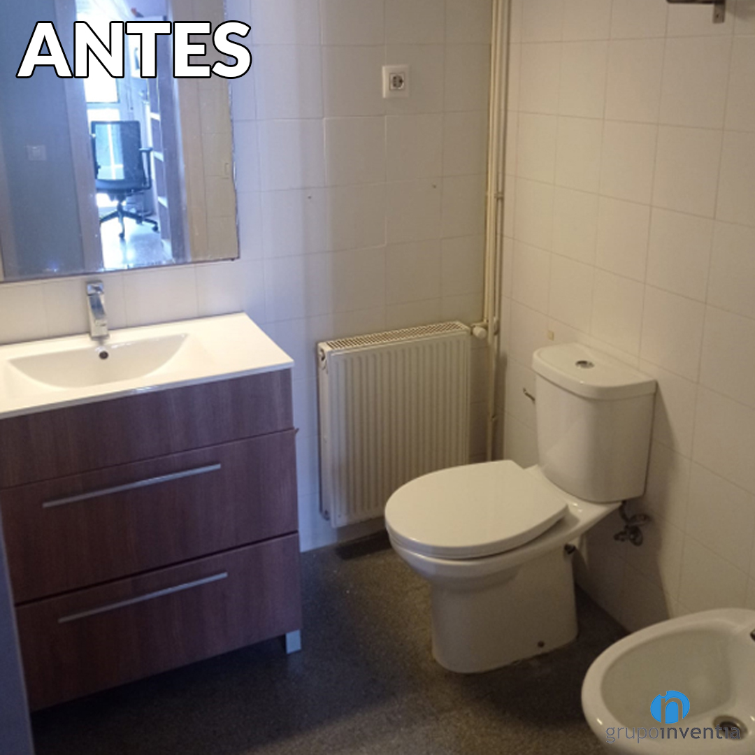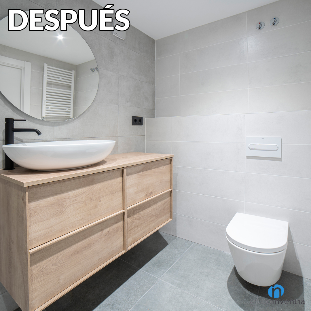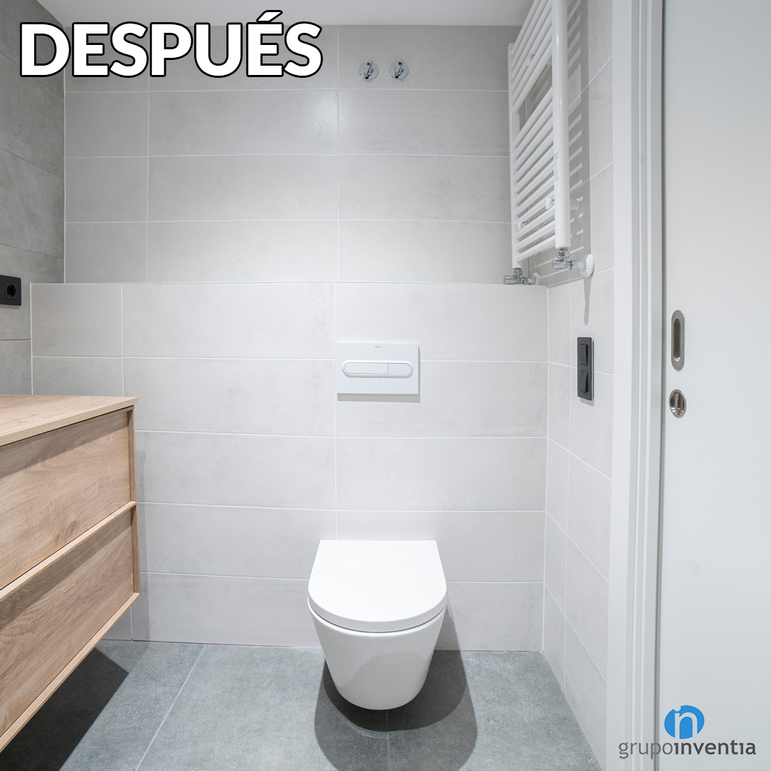 Otro de los cambios necesarios en este cuarto de baño era el de su equipamiento sanitario. Para esta parcela se ha apostado por sanitarios modernos y funcionales. En Grupo Inventia trabajamos con los mejores distribuidores del mercado y garantizamos la calidad de cada pieza que nos encargamos de instalar. Un cambio es que en la pared del lado derecho se ha pasado de una pareja de inodoro y bidet a sólo inodoro, aunque con una excelente mejora.