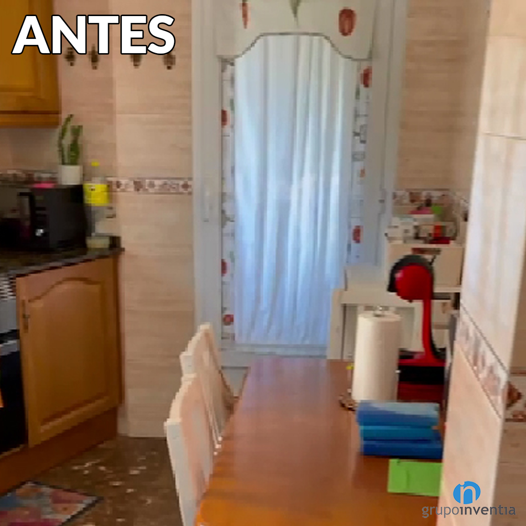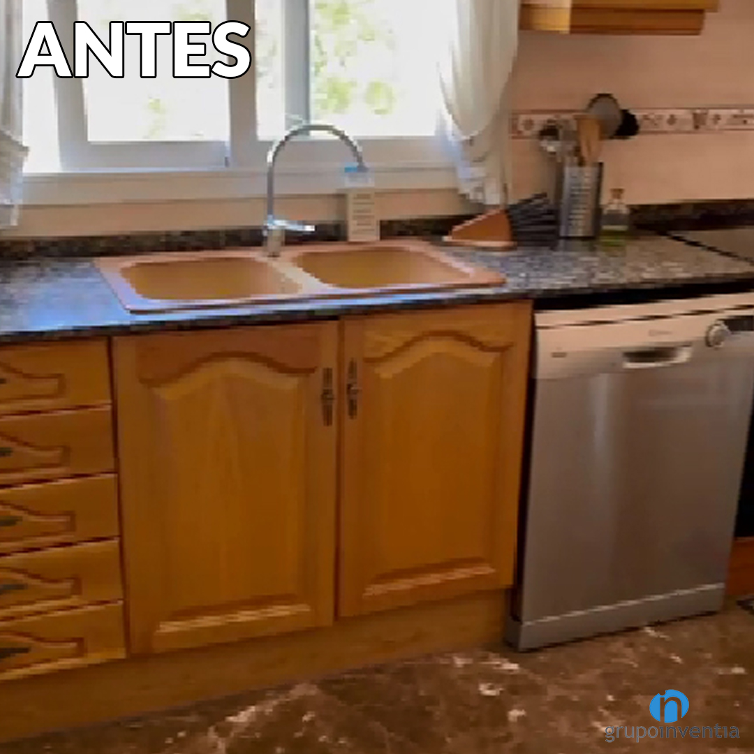 Ahora el mobiliario de cocina se presenta en una imagen más moderna y pasa de unos muebles de madera bastos a líneas muy fluidas. Uno de los aspectos que se ha mantenido en esta reforma de cocina es el pavimento. Al estar en buen estado nuestros profesionales se han encargado de limpiarlo y pulirlo para que brille como el primer día.