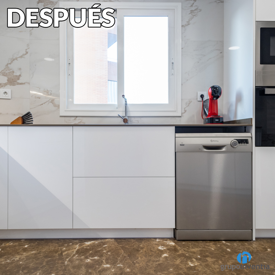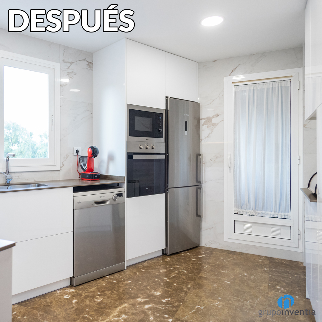 Tras la reforma de cocina los electrodomésticos principales se ubican en el extremo derecho del mueble de cocina. Unos huecos a medida permiten integrad la nevera, el horno y el microondas. En la parte inferior de la encimera se ha mantenido el espacio para el lavavajillas, ya que era el correcto.