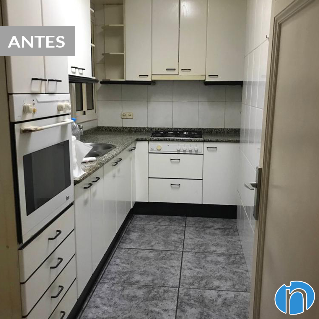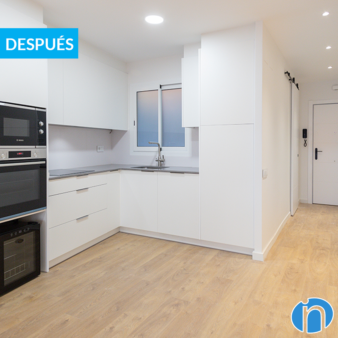 Uno de los cambios más importantes en esta reforma en Barcelona es el paso de una cocina independiente a una cocina abierta al salón. Además la nueva cocina se ha instalado en un lugar distinto al original. Se ha llevado a cabo un derribo de paredes perfecto y también se ha redistribuido el espacio.