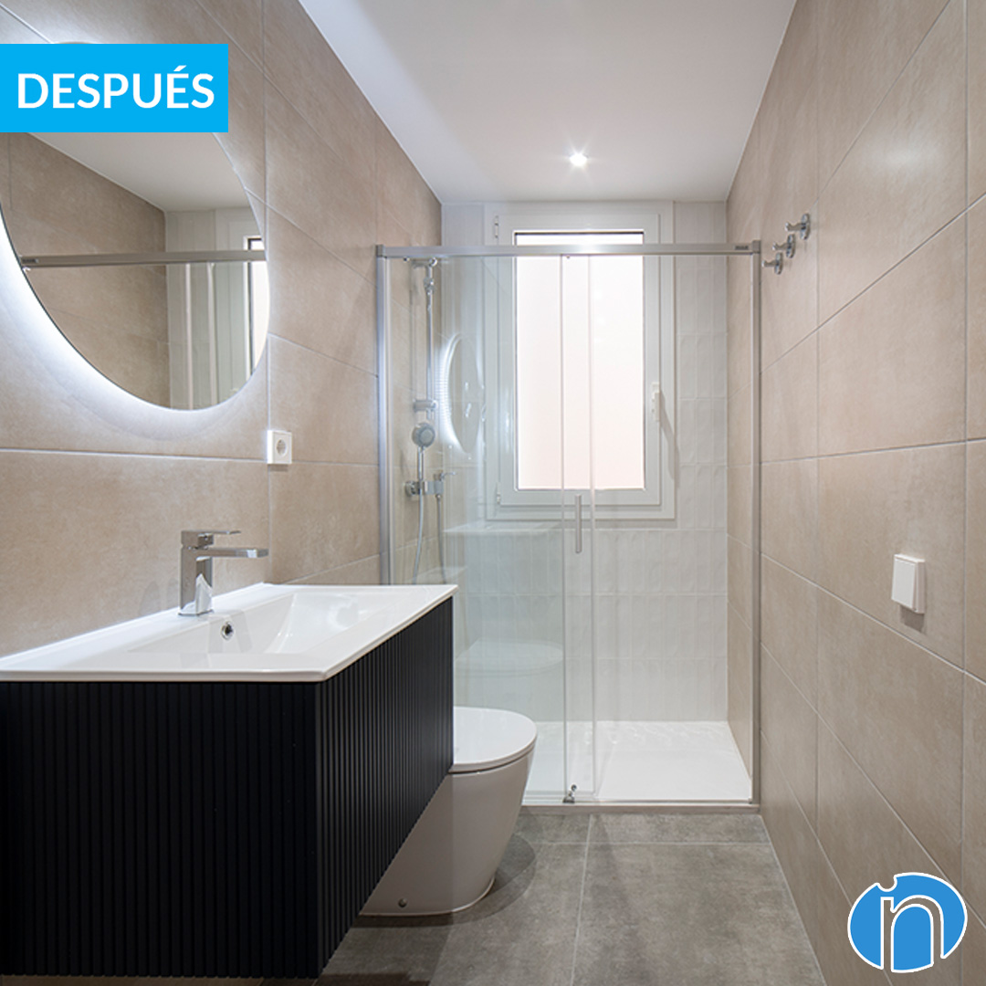 También hemos modernizado la imagen del cuarto de baño y ahora está muy cambiado respecto al original. Por ejemplo, los azulejos de color marrón oscuro han pasado a ser de color beige. Además, al disponer de una ventana mucho más grande hay más luz natural en el baño. El ambiente es mucho más fresco y agradable.