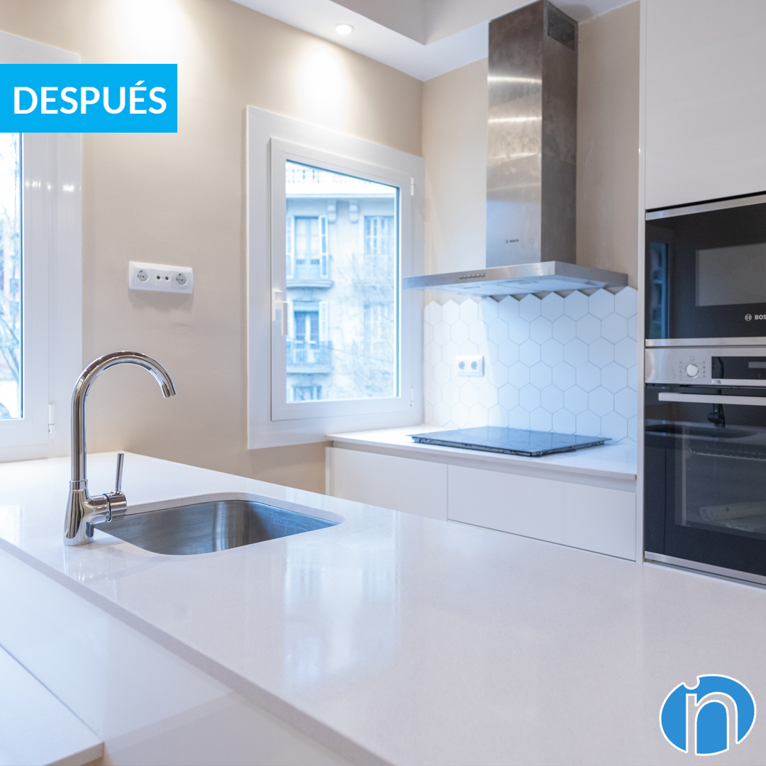 Todo ello se presenta con una nueva imagen acorde al diseño interior global de toda la vivienda. El mueble de cocina es de color blanco y dispone de capacidad de almacenaje en la zona inferior de las encimeras. En conjunto con las paredes beige del resto de la estancia se genera un espacio muy luminoso y visualmente amplio.