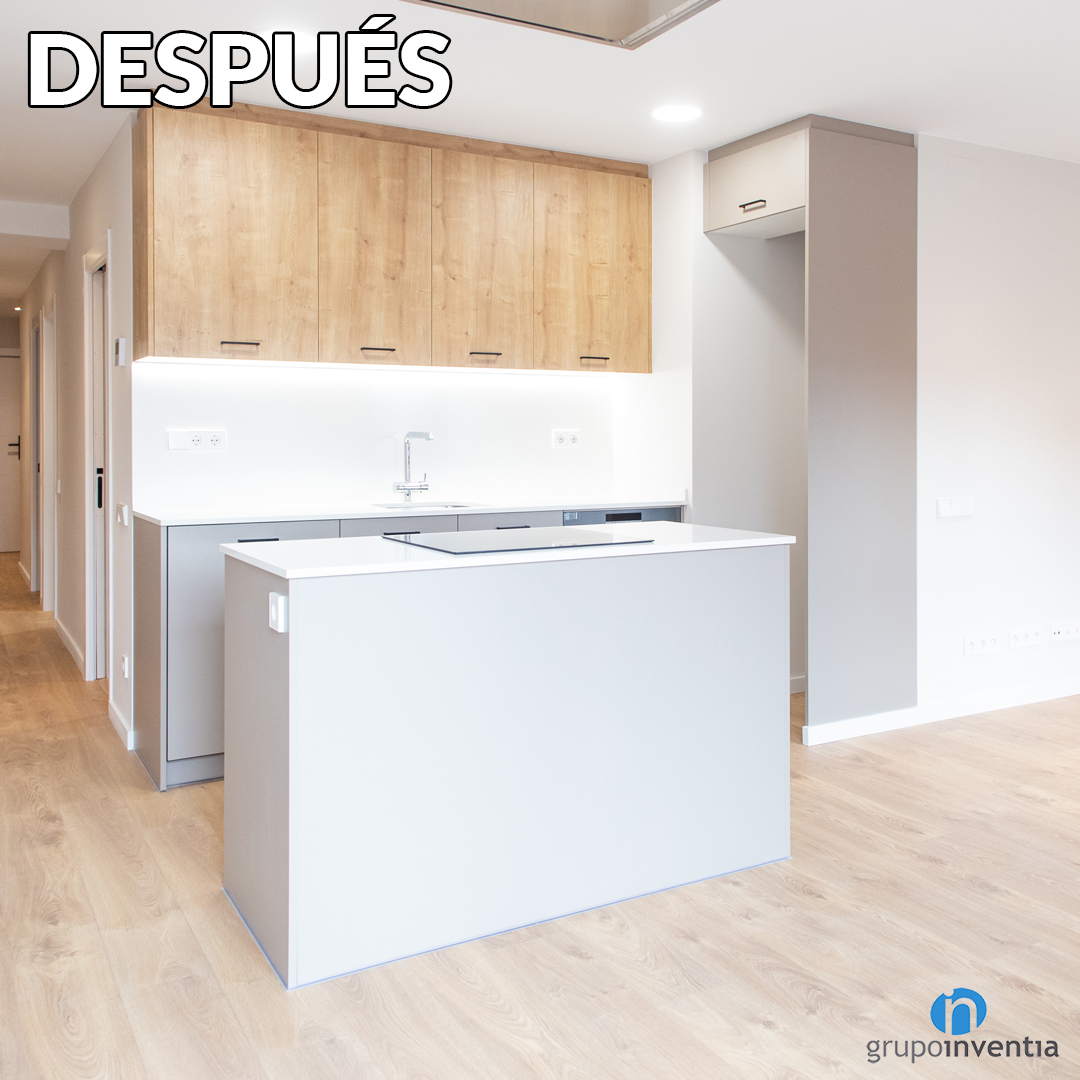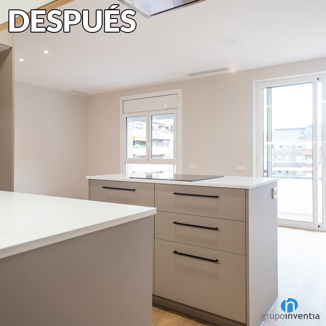 Justo delante vemos una isla de cocina. Esta amplia la capacidad de almacenaje y la superficie de apoyo. Aquí se ha instalado la placa de cocción, acompañada por una campana extractora integrada en el techo. El antes y después de la cocina es un buen ejemplo para constatar el gran equipo de reforma integral con el que cuenta Grupo Inventia.