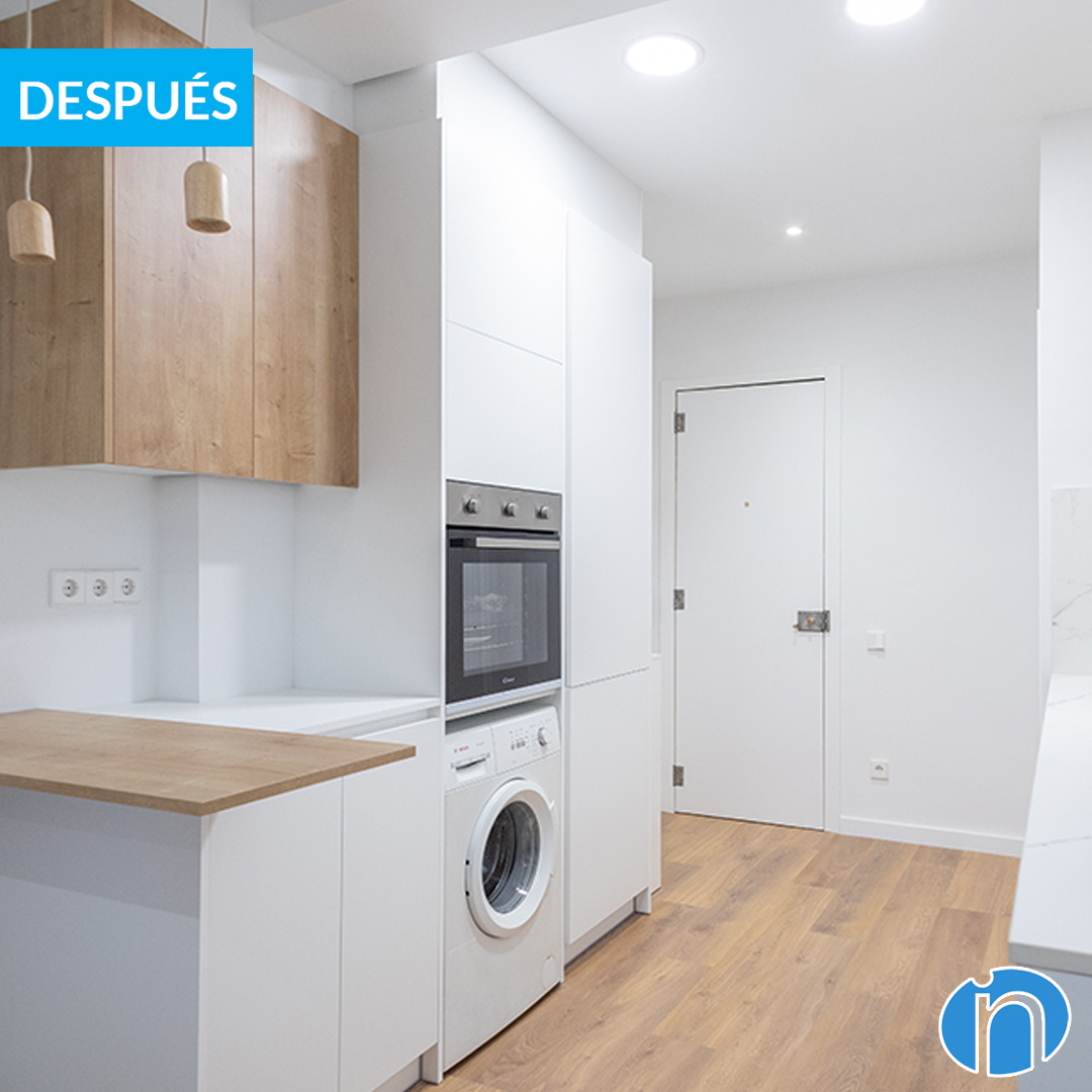 Los nuevos electrodomésticos están situados en el lugar indicado para ofrecer un uso funcional. En el lado izquierdo se han integrado varios electrodomésticos como la nevera, el horno y el microondas. También dispone de capacidad de almacenaje y de superficie de apoyo y de trabajo.