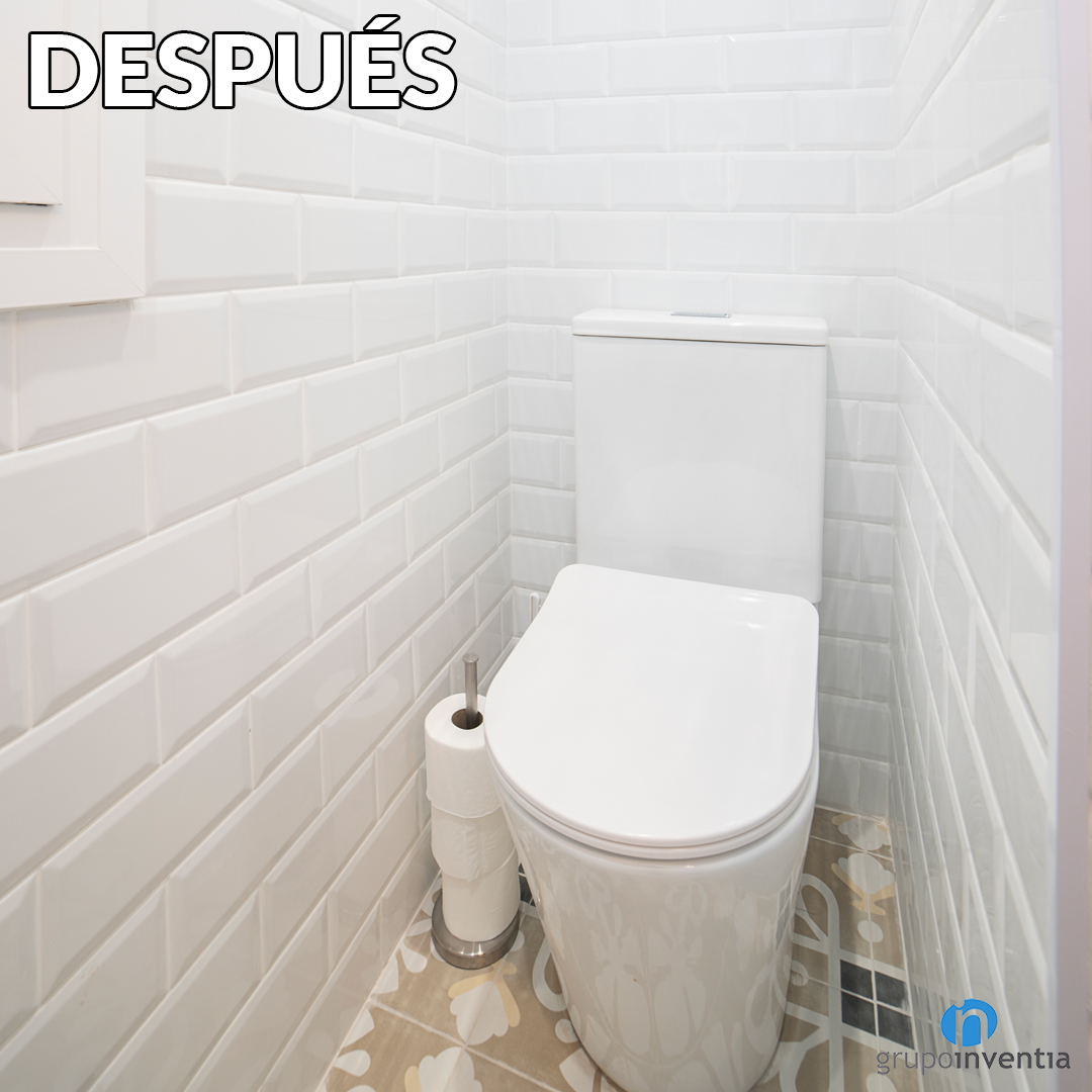 Òbviament tot s’ha canviat d’acord amb el disseny interior contemporani que s’ha imprès a tots els espais. A la modernitat dels nous sanitaris se suma la nova imatge de la cambra de bany. En aquest cas les parets s’han enrajolat per complet amb rajoles bisellades de color blanc. També s’ha canviat el terra, passant d’unes rajoles de gres groguenques a un elegant terra tipus hidràulic.
