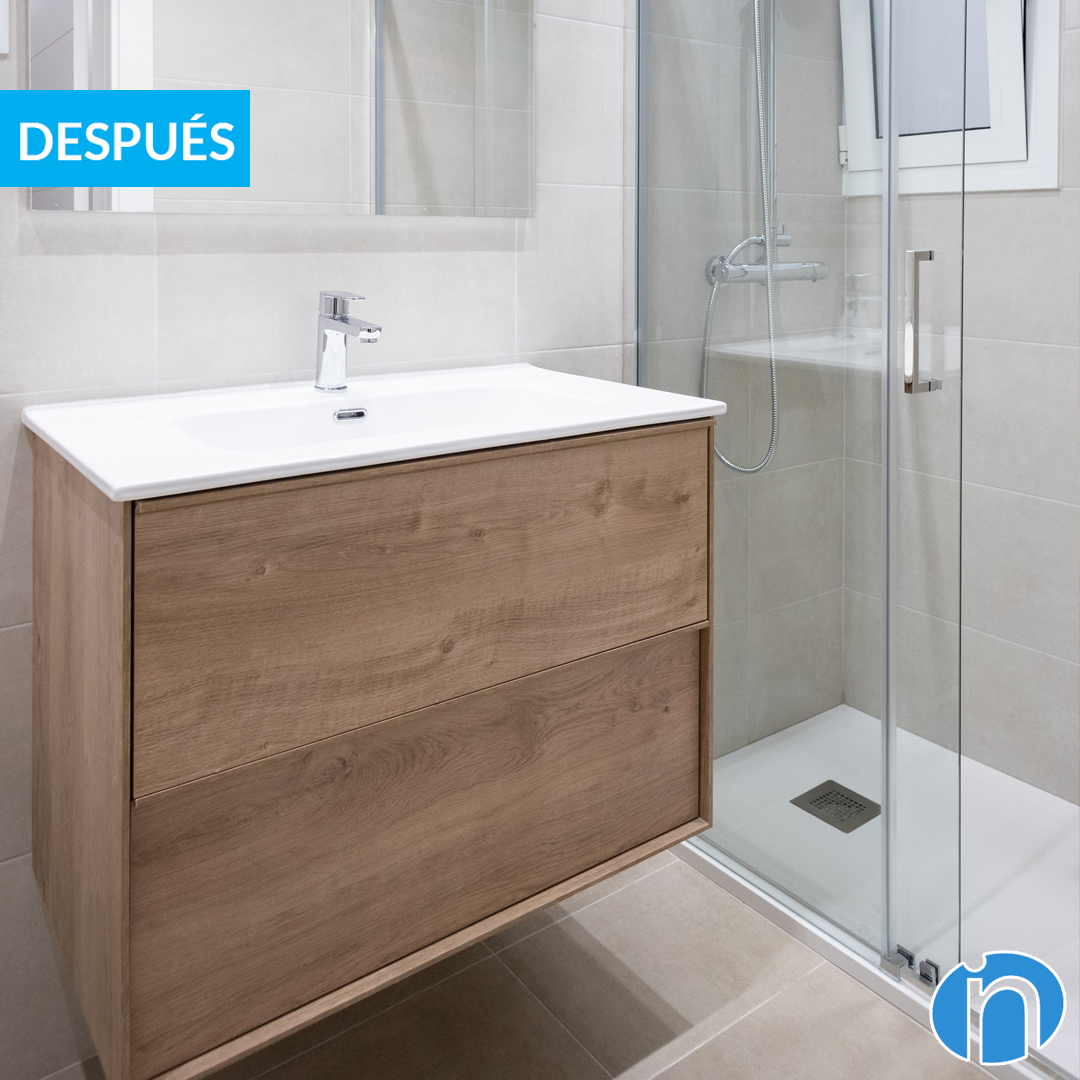 A més d’actualitzar la imatge, també ens hem encarregat d’instal·lar el nou equipament sanitari. Es compon d’un lavabo més funcional que manté la capacitat d’emmagatzematge sense ocupar tant d’espai. També us acompanyen un nou vàter i una zona d’aigües totalment adaptada. És un plat de dutxa amb unes mampares de portes corredisses.