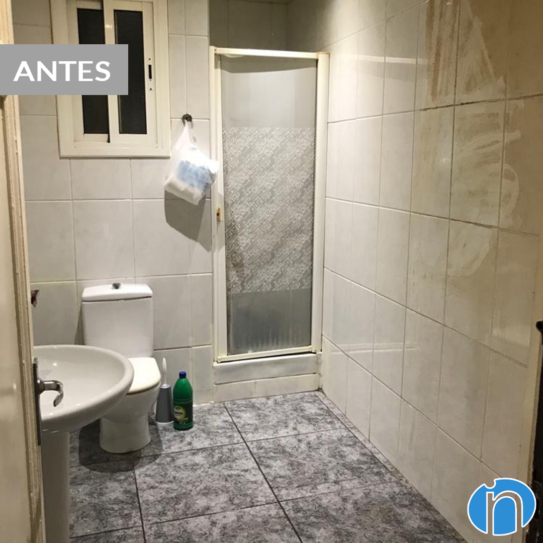 Pel que fa a la imatge original ha canviat tot. Ara la cambra de bany es presenta com un espai acollidor i que ofereix un ambient perfecte per a l’ús diari. Les parets s’han enrajolat completament amb rajoles de color beige. Per la seva banda, el nou paviment és de rajoles grises. Es tracta d’un material perfecte per a la cambra de bany, resistent i senzill de netejar.