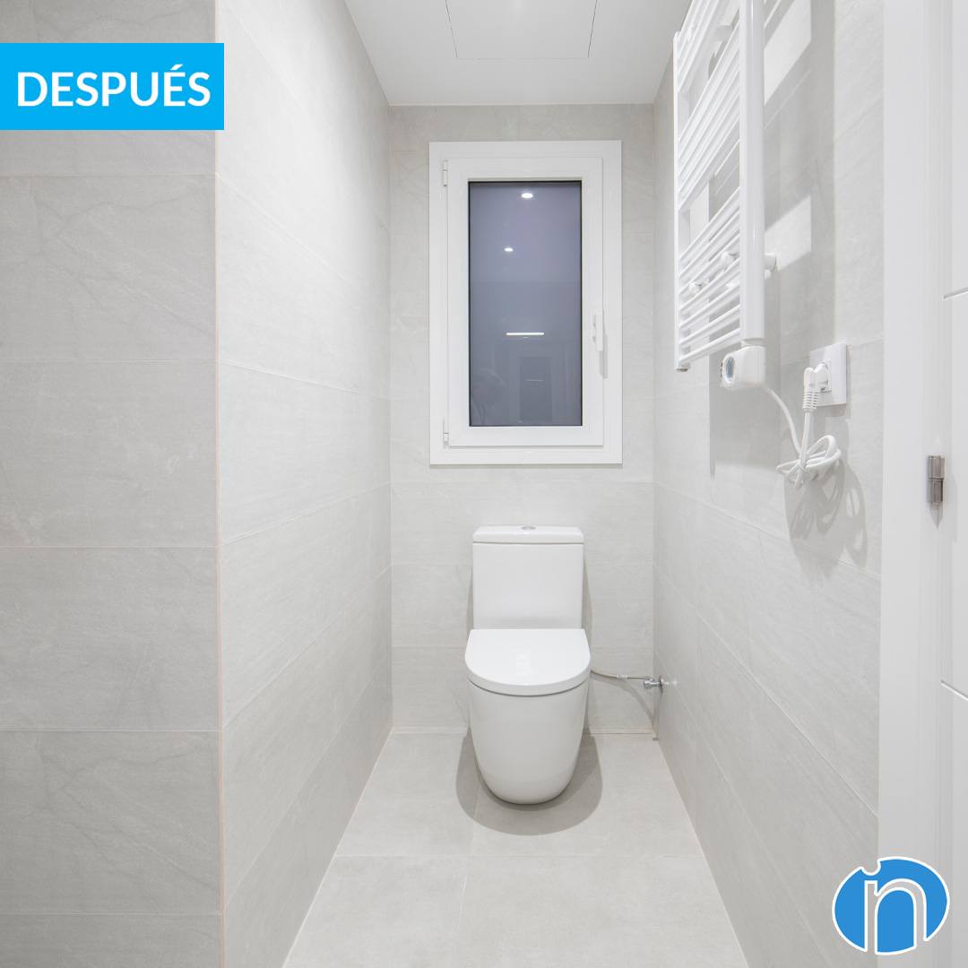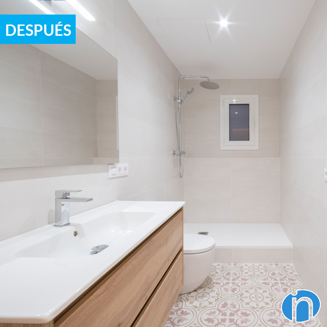 En aquesta reforma a Barcelona també ens hem encarregat de renovar els banys de l’habitatge. Originalment tenia una cambra de bany, que hem millorat, i un lavabo. Aquest darrer ho hem eliminat i hem creat un bany complet, amb lavabo, inodor i plat de dutxa. Se situa al lloc original de la cuina.