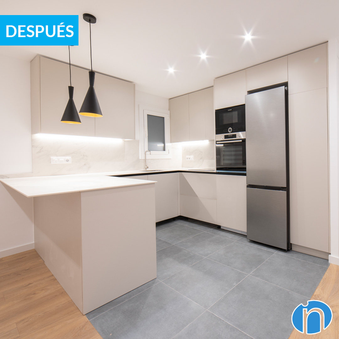 Ara la cuina està distribuïda en forma d’U i disposa d’un equipament complet ubicat als llocs més funcionals. A l’extrem dret trobem els electrodomèstics integrats. A partir d’aquí neix un taulell en forma d’U. Hi hem instal·lat tant la placa de cocció com l’aigüera.