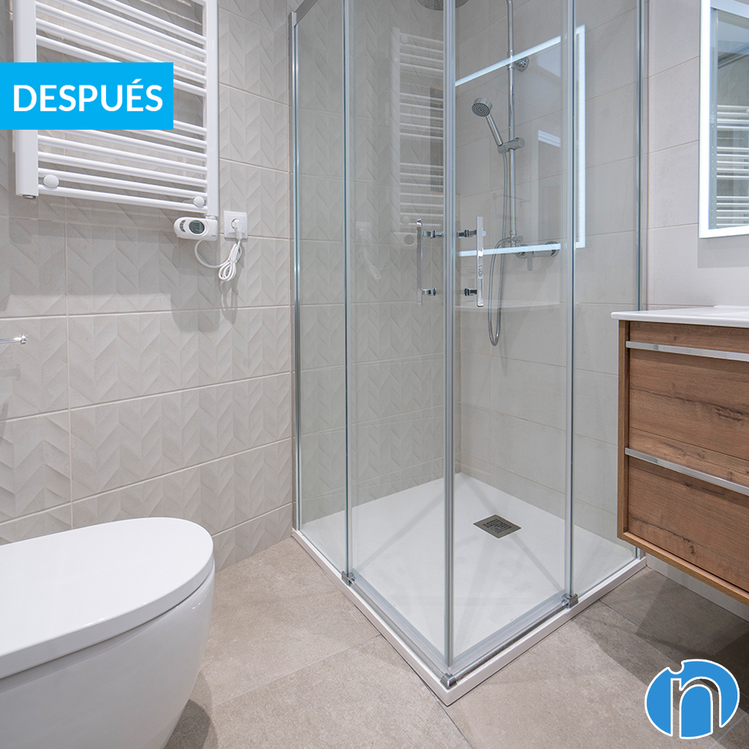 El nou equipament sanitari daquesta reforma de bany es completa amb un nou vàter i la zona daigües. Per a aquesta última s’ha triat un plat de dutxa cantonera que queda protegit per unes mampares de portes corredisses. Les mampares que s’han col·locat són transparents i no resten espai visual a l’espai del bany.