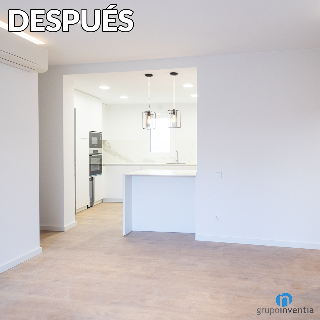 Un dels canvis significatius en l’abans i després d’aquesta reforma integral és la cuina. Ha passat de situar-se en una estada independent a ser una cuina oberta. Per a això s’ha enderrocat la paret de la sala i s’ha creat un espai diàfan ampli i amb millors característiques. Com veurem en l’apartat de el disseny interior, per a la nova imatge s’ha optat per color clars.