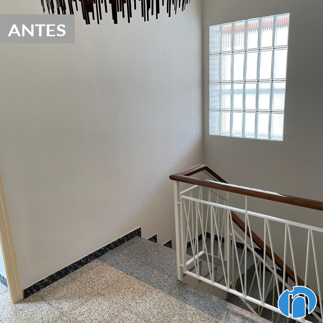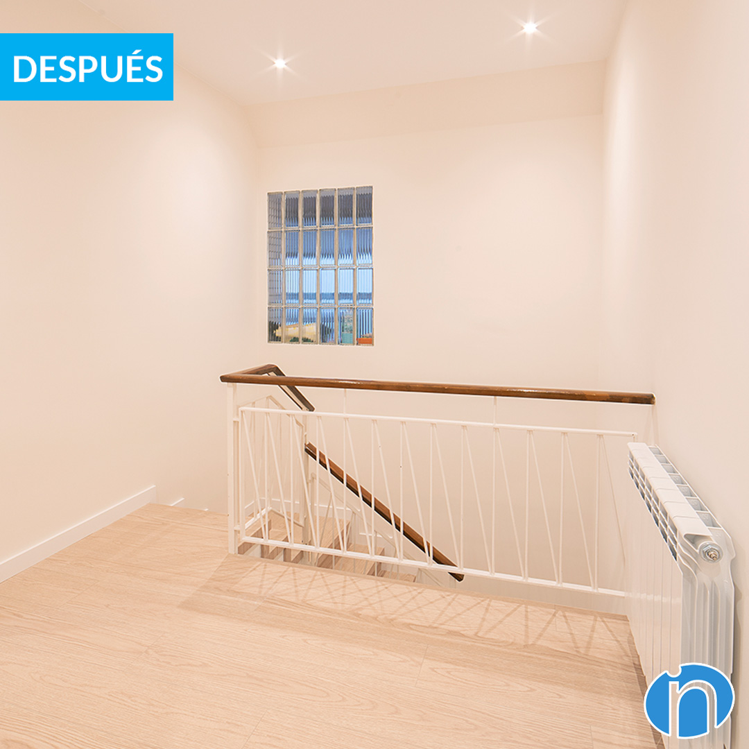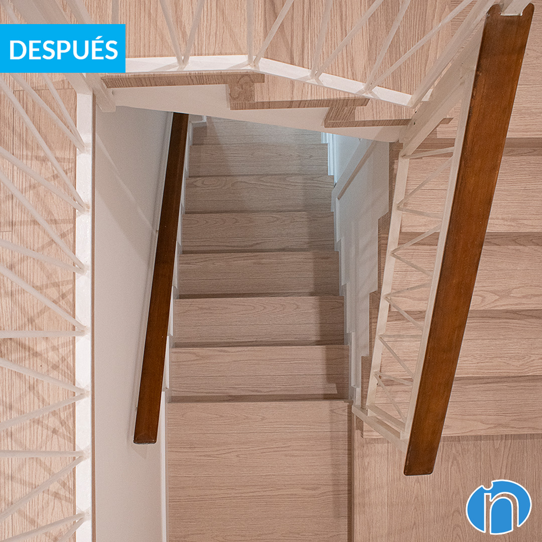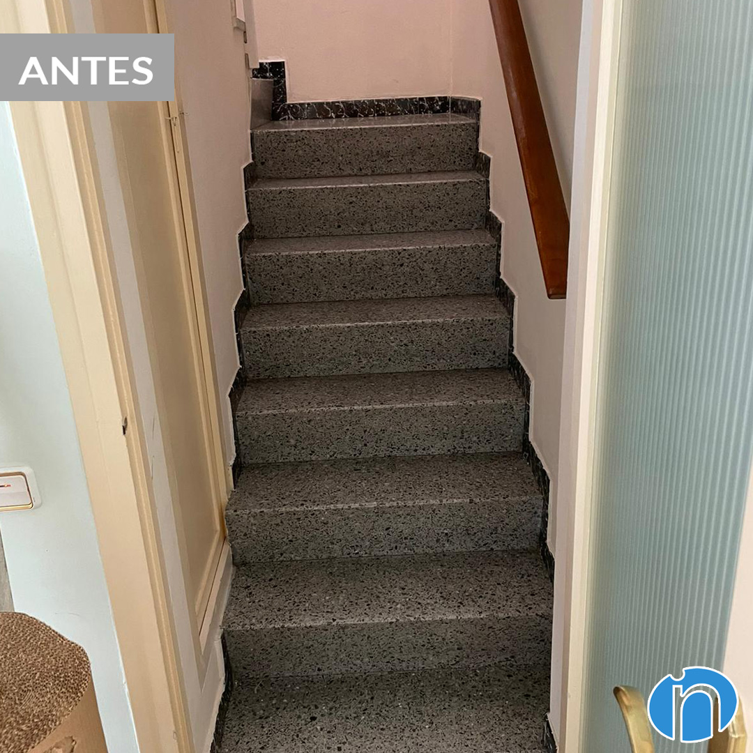 També ens hem encarregat de restaurar les escales interiors que connecten les plantes d’aquest habitatge. Els graons de pedra originals han estat coberts amb làmines de fusta a joc amb el nou paviment que ja hem esmentat. Per la seva banda, s’ha mantingut la barana metàl·lica amb passamans de fusta.
