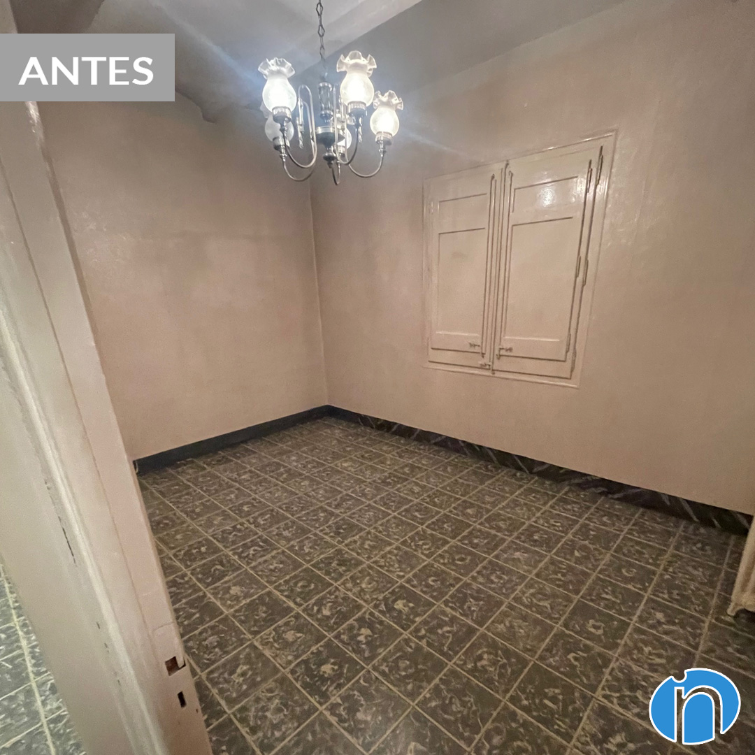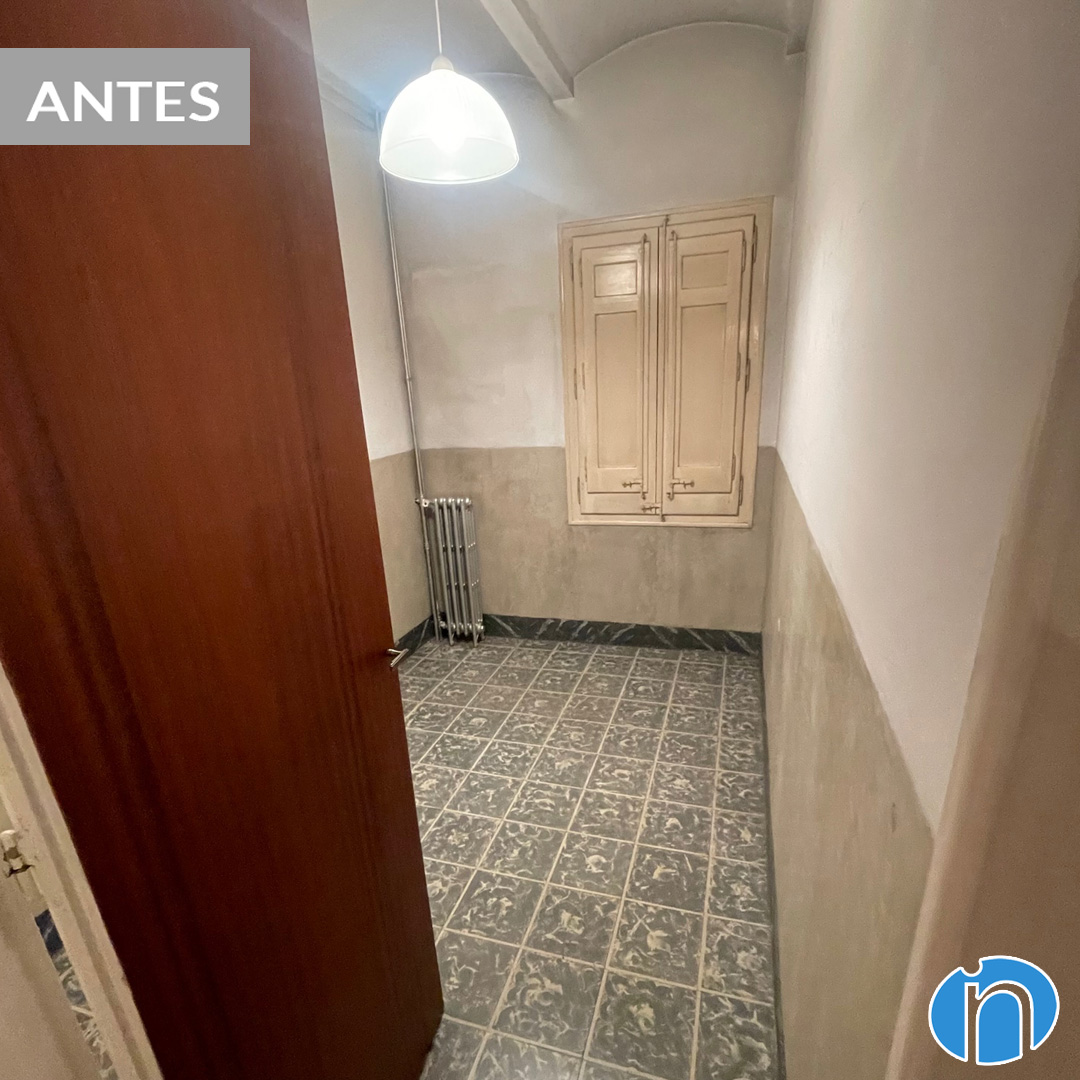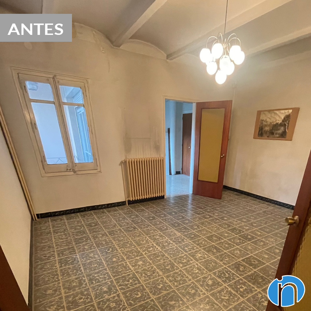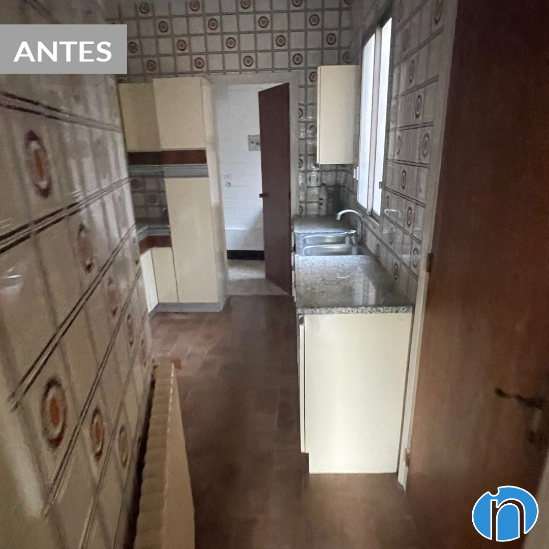 Hem retirat l’antic mobiliari i hem tret les rajoles de la cuina original. Ara la cuina llueix una imatge neutra amb el moble de cuina i les parets de color blanc. L’hem dotat de més lluminositat i sensació d’amplitud. Comparant abans i després de la reforma de cuina es nota una gran diferència.