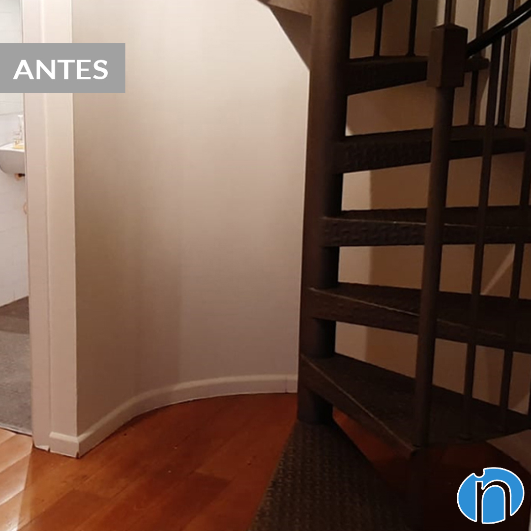 Concretament les escales que connecten les dues plantes de la vivenda. Ens hem encarregat de restaurar-les i confirmar-ne un alt grau de seguretat. Ara les escales metàl·liques de cargol llueixen genial i són segures. Per finalitzar també hem retirat el paviment original i hem col·locat un terra de parquet en tons mitjans de fusta. Ha estat la cirereta per aconseguir una llar d’ambient càlida i acollidora.