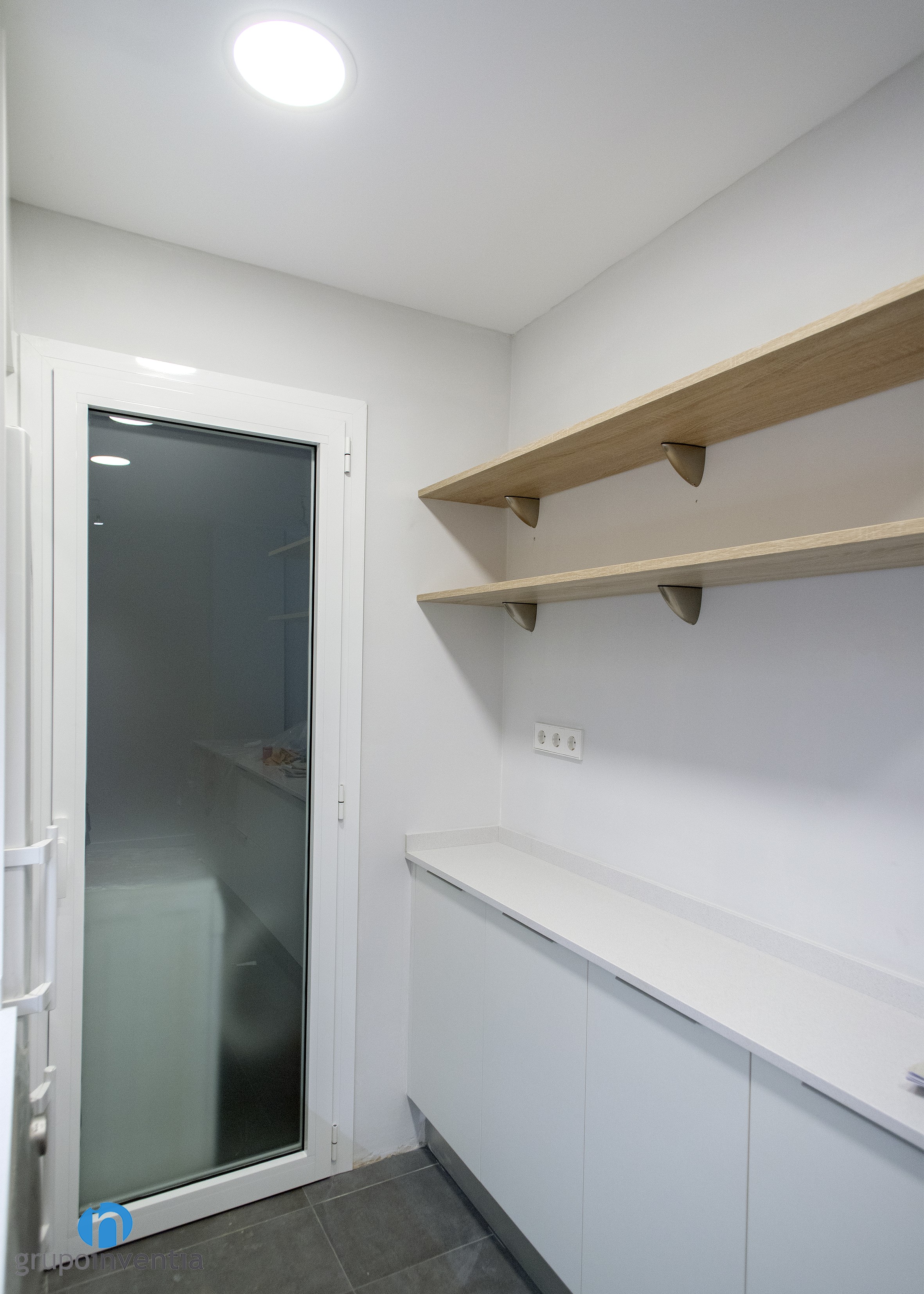 Per a la disposició dels nous elements de la cuina es va utilitzar una distribució en forma lineal, aconseguint aprofitar al màxim l’espai disponible. A l’extrem de la dreta es va deixar un buit a mida per posar la nevera i seguidament neix el taulell. Aquest, a més d’oferir una àmplia superfície de recolzament, es va equipar amb una pica i una cuina de tres fogons. Al nou equipament de cuina també se li sumen un forn i un rentavaixelles, encastats a la part inferior del taulell de cuina.