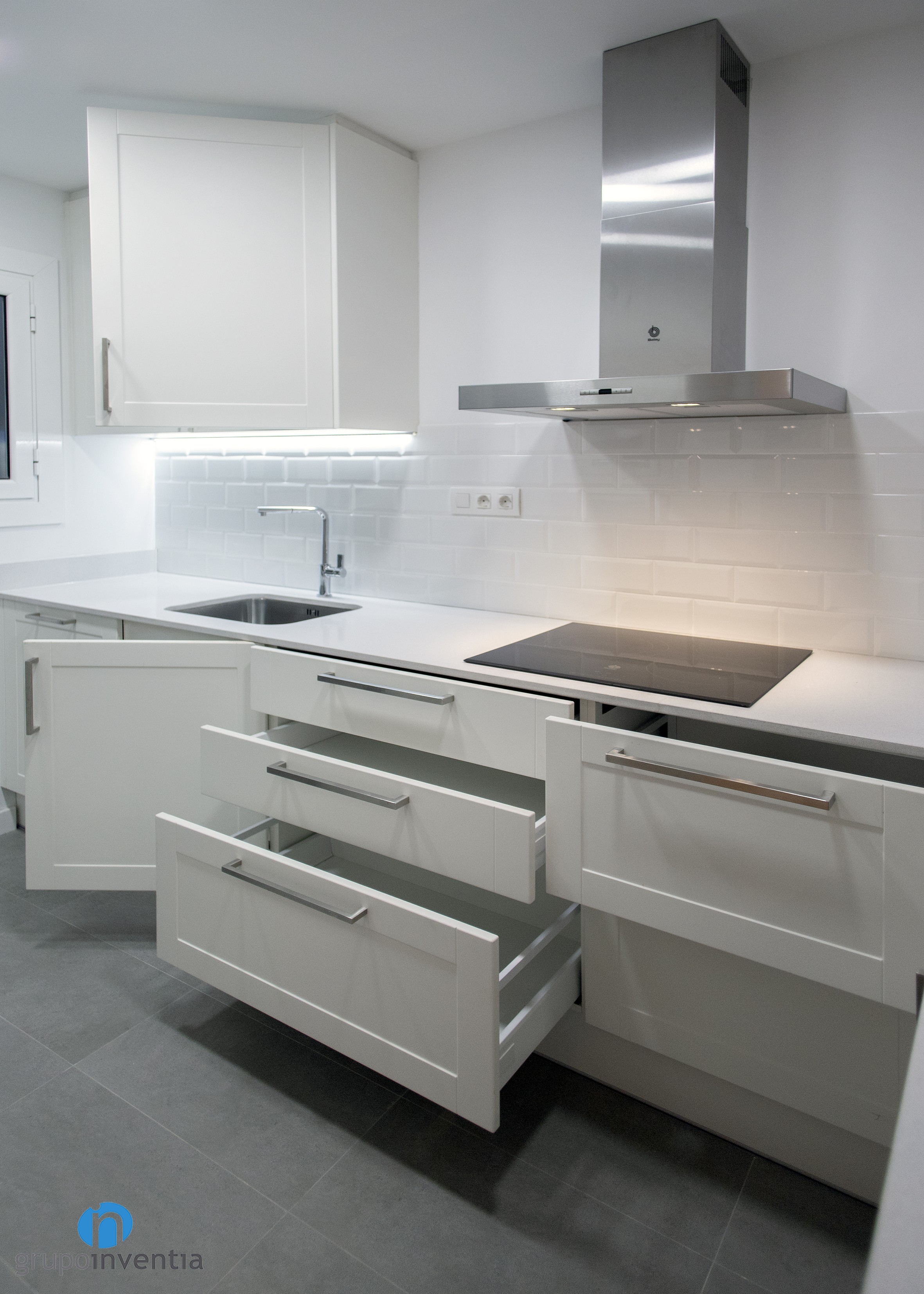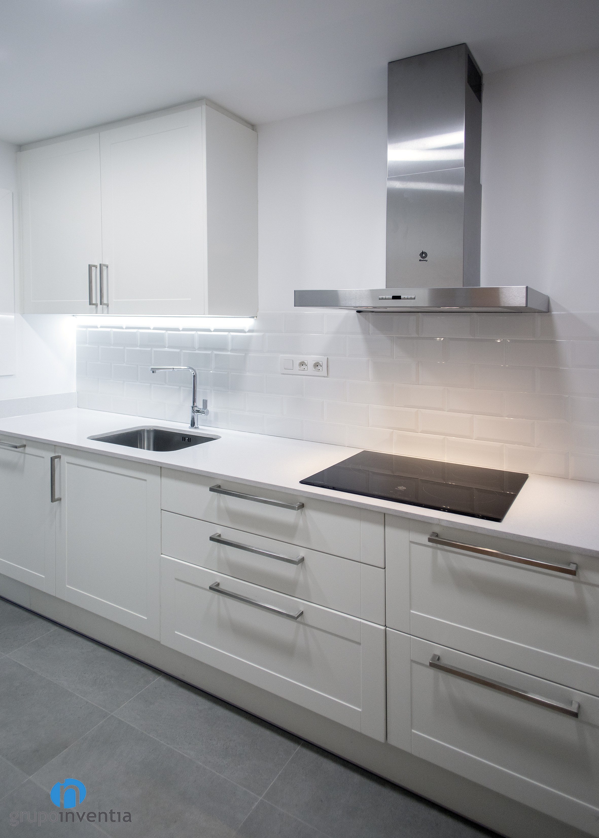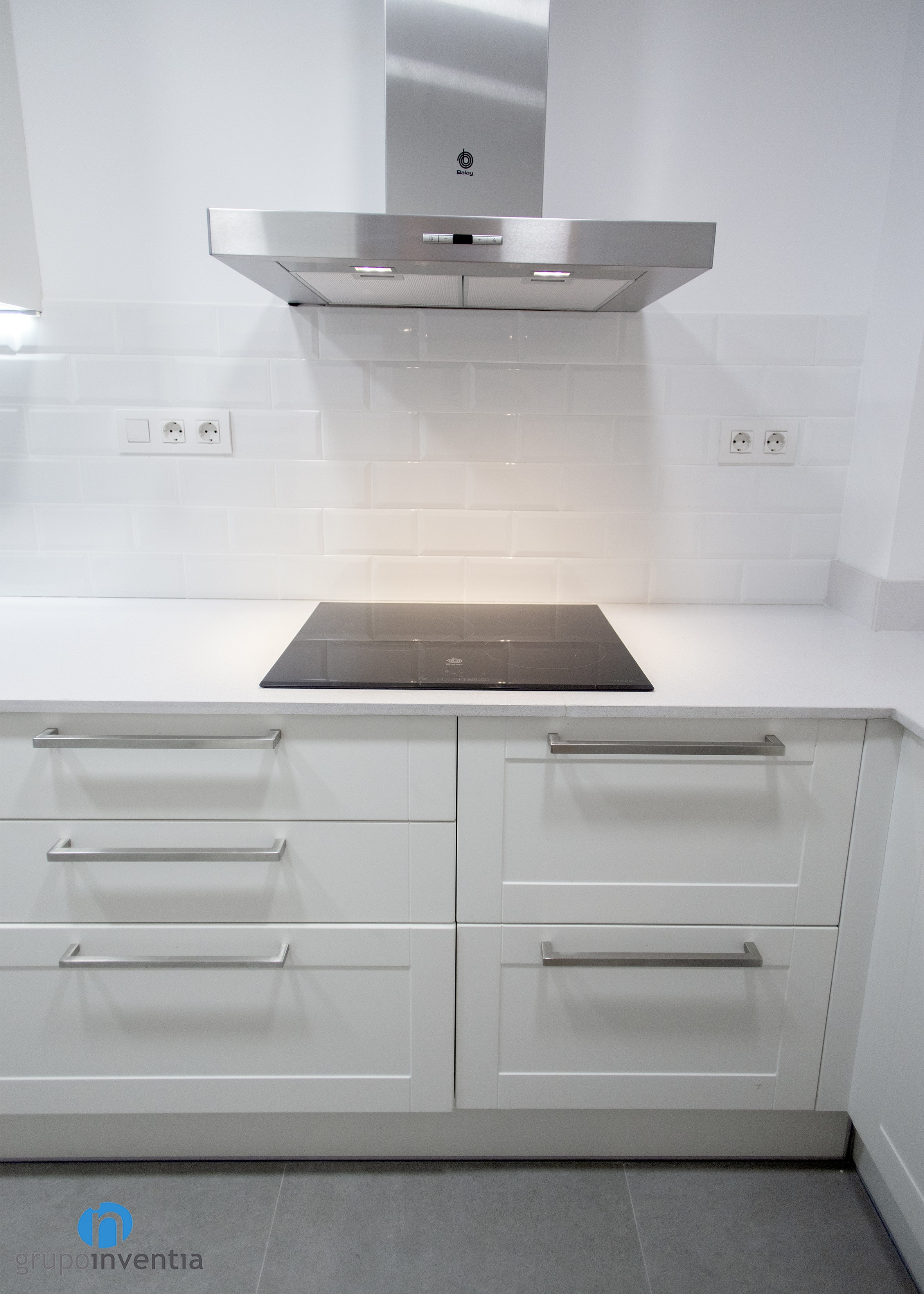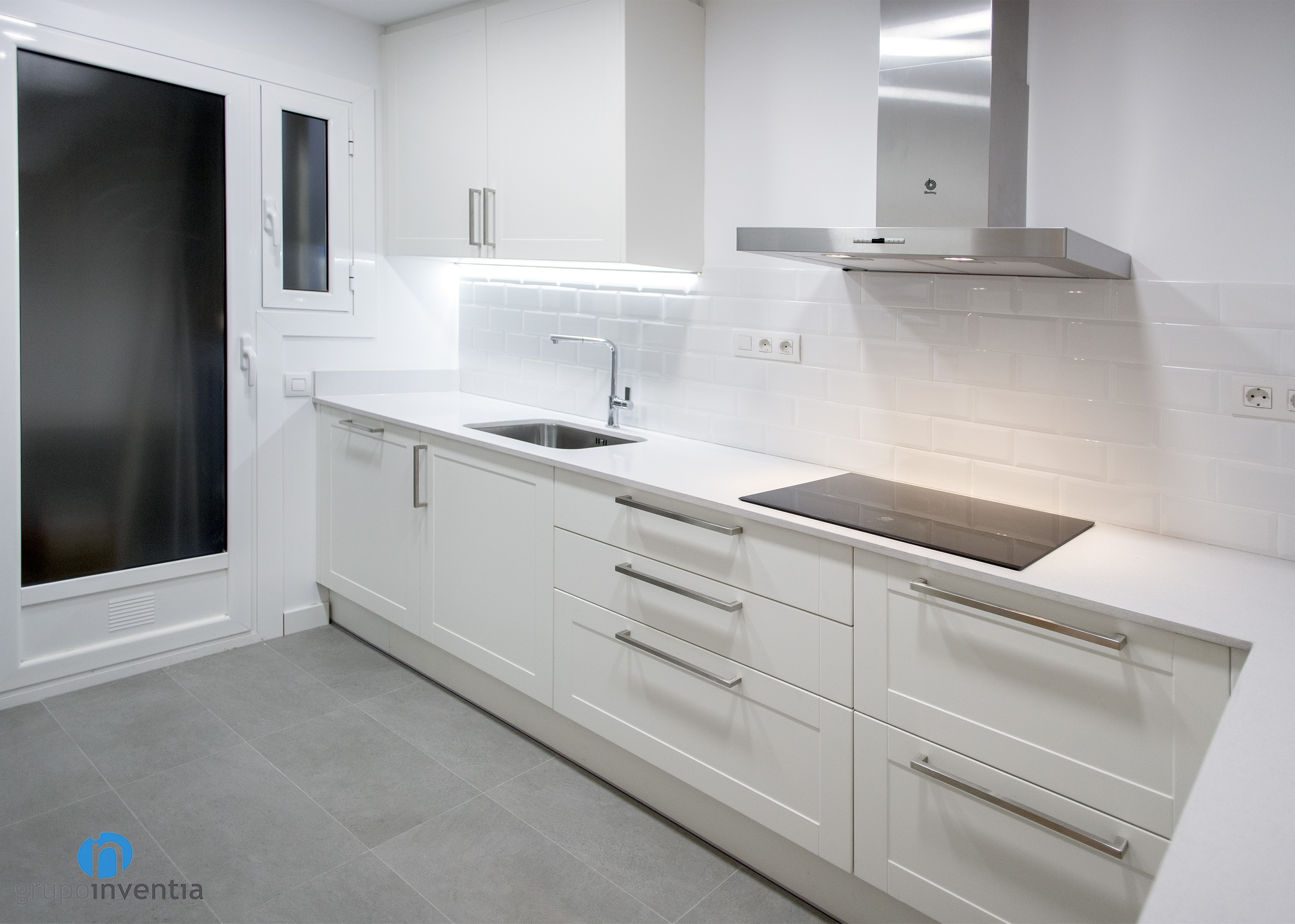 Després de la reforma, la cuina presenta una imatge molt contemporània en la qual el blanc és el protagonista principal. Aquest color s’utilitza en el moble de cuina, els taulells i les parets. Amb això s’aconsegueix una estança lluminosa i àmplia visualment en què també tenen cabuda altres tonalitats com el gris del sòl o l’acabat en acer inoxidable dels electrodomèstics.