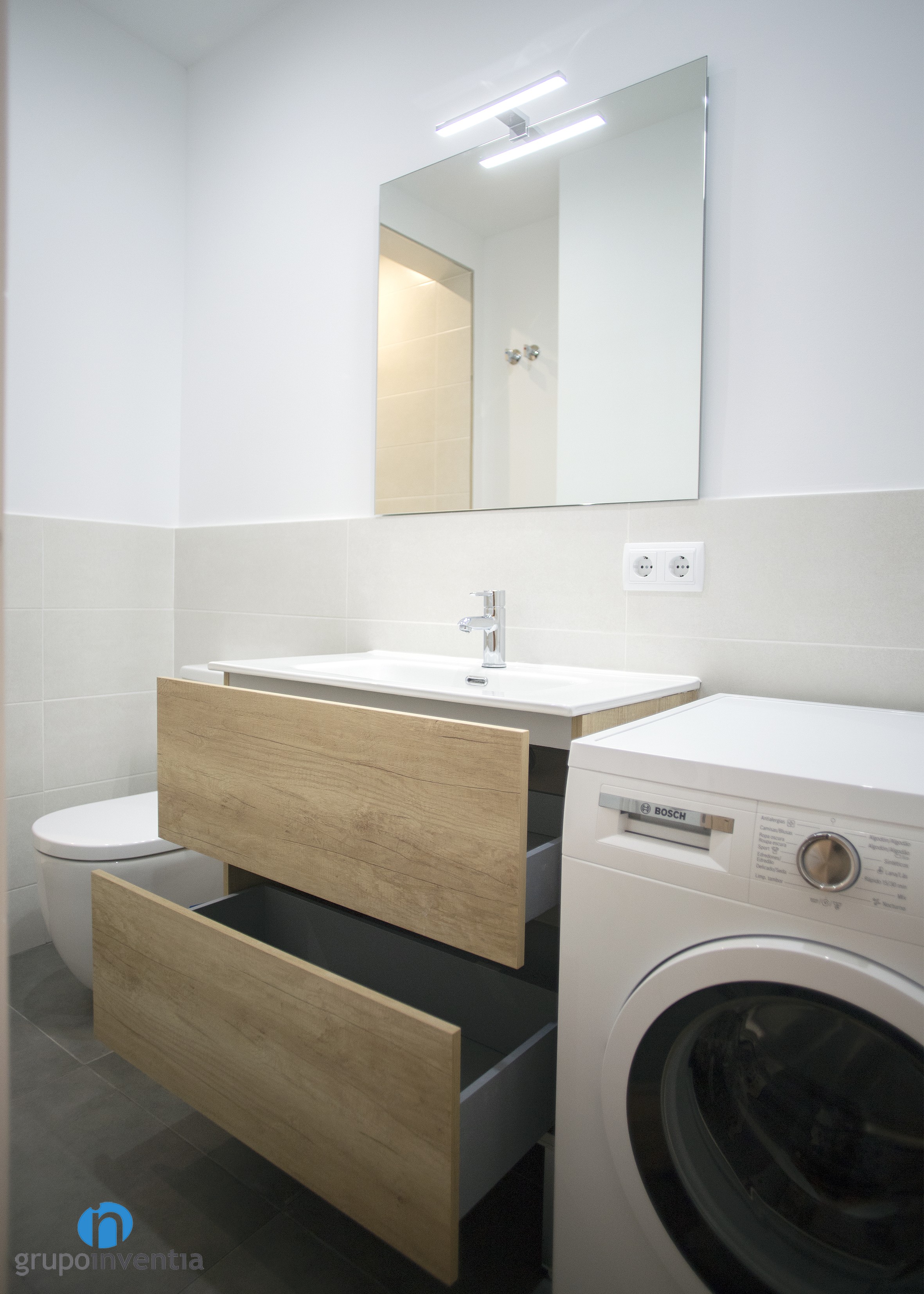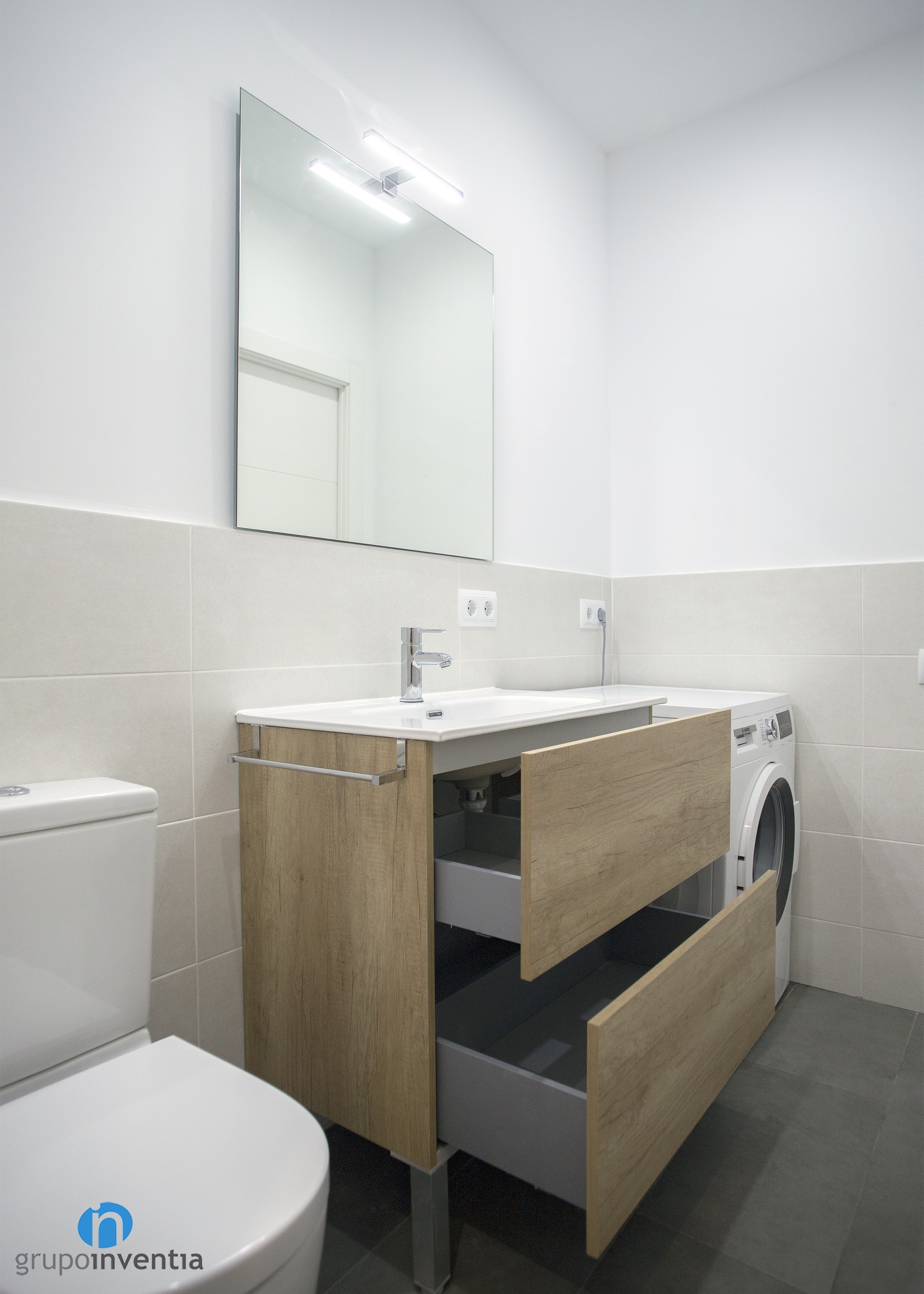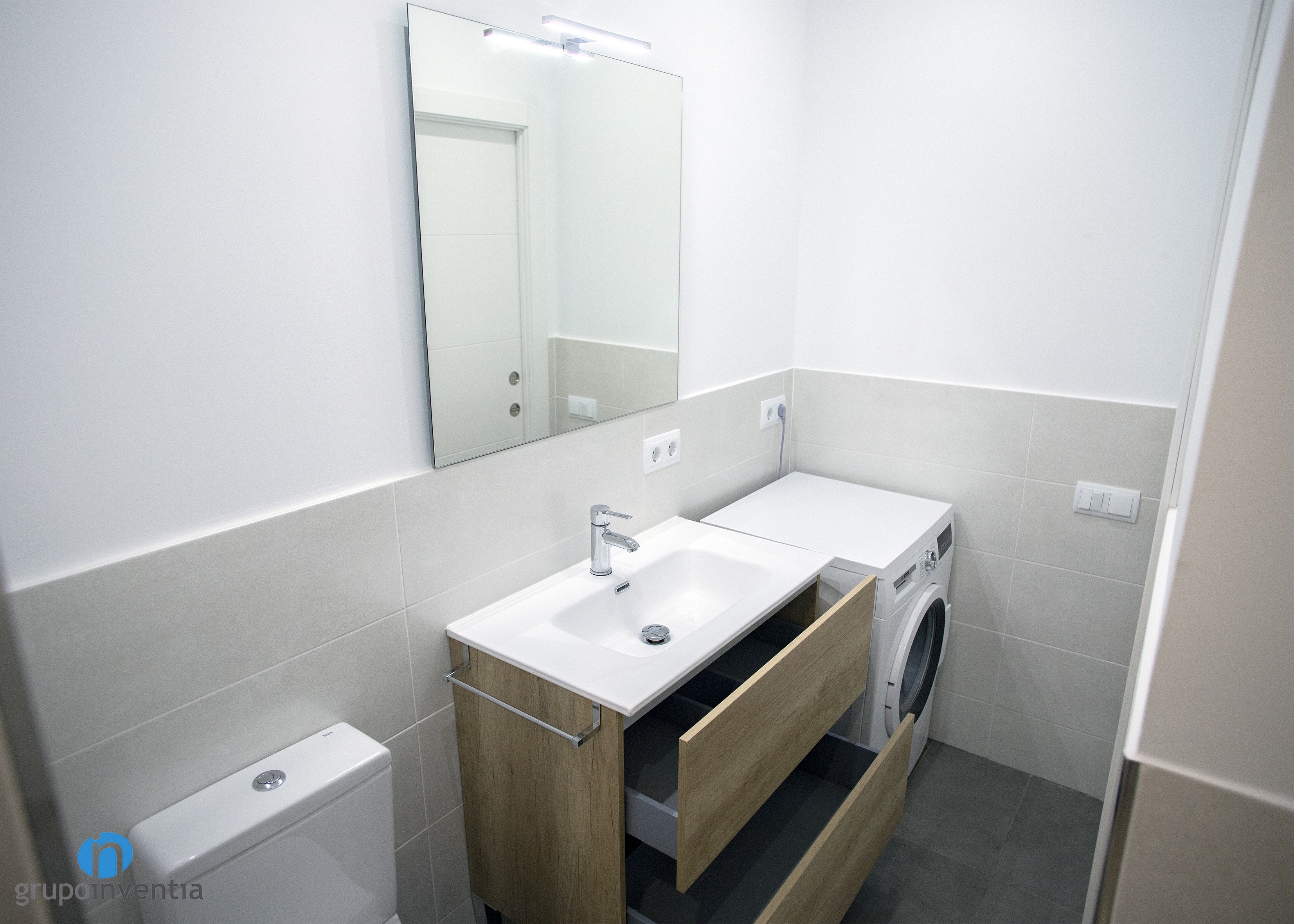 En la cambra de bany es va millorar la imatge i es va col·locar un complet equipament sanitari que ofereix les millors prestacions en el seu ús. Aquest està compost per un lavabo amb calaixera incorporada, un vàter i una dutxa. A més, va quedar espai per col·locar la rentadora, aconseguint aprofitar l’espai disponible al màxim.