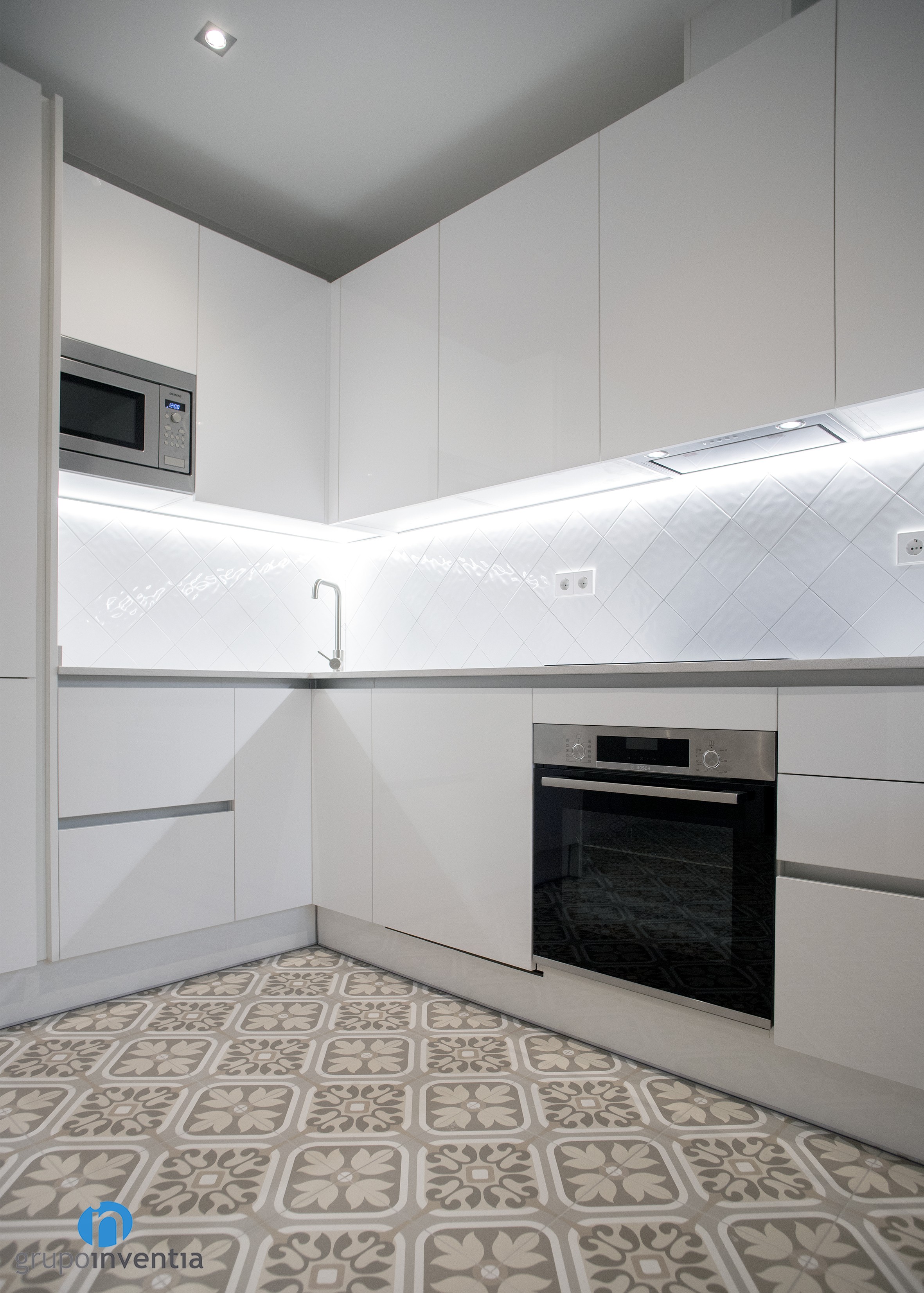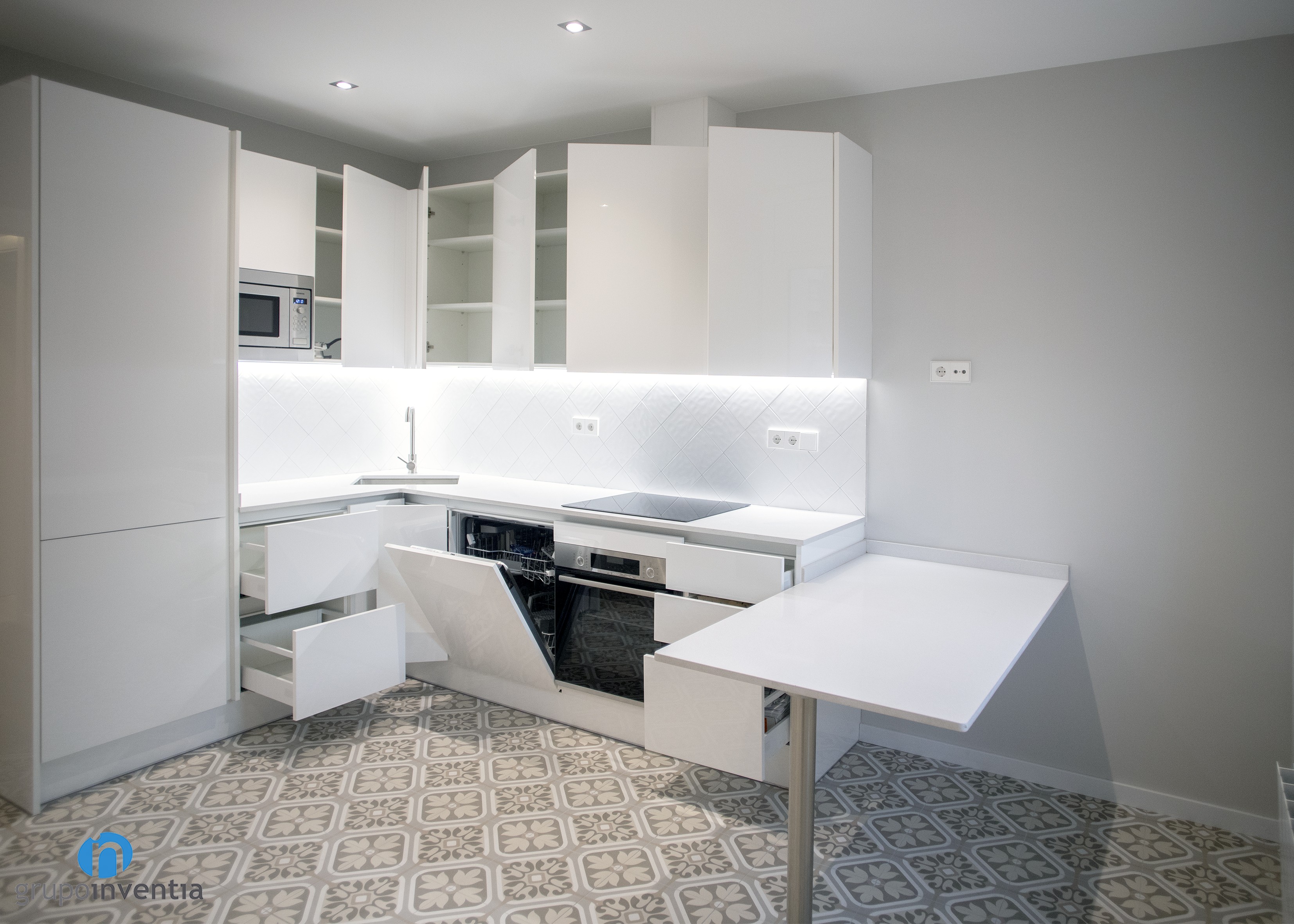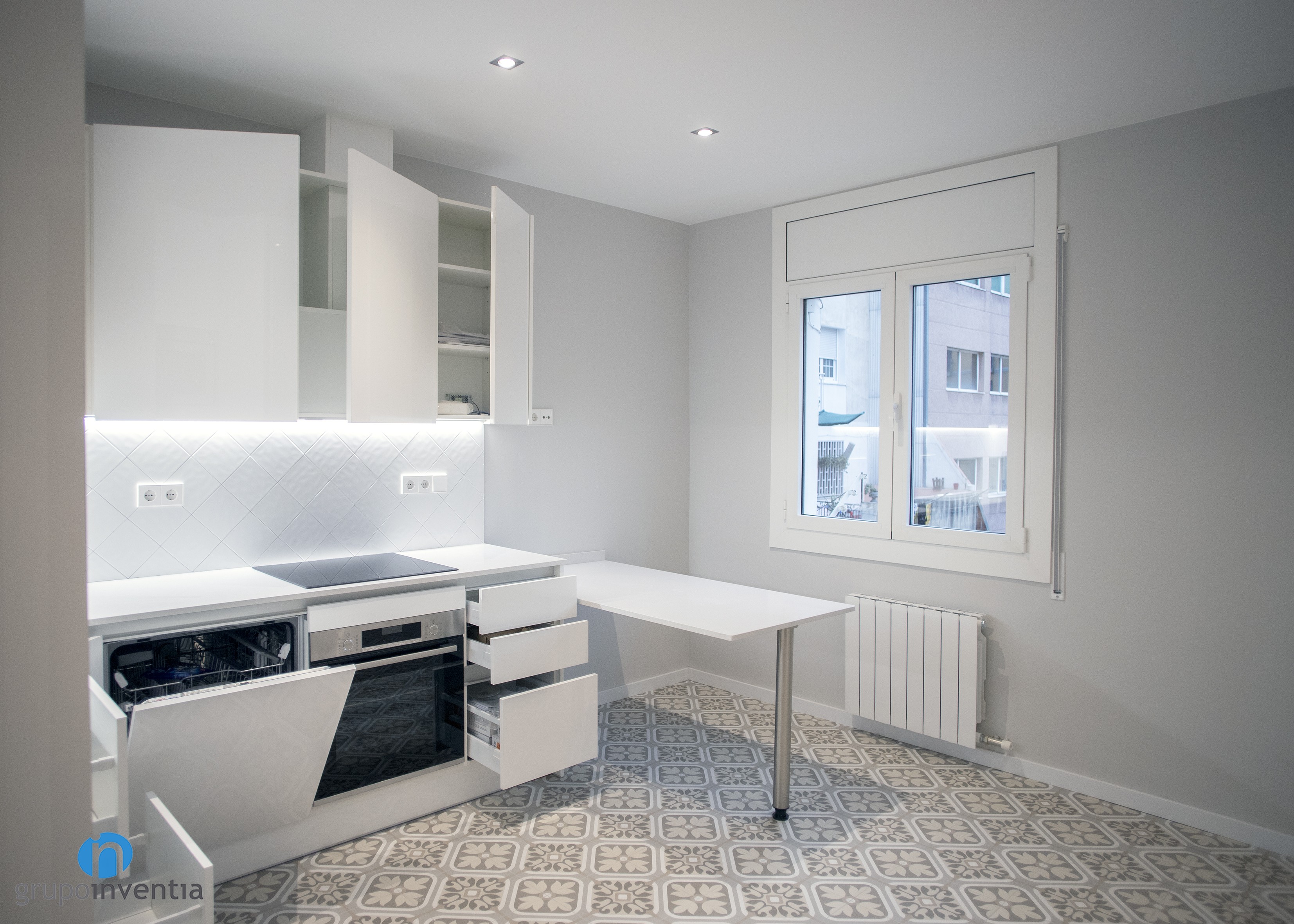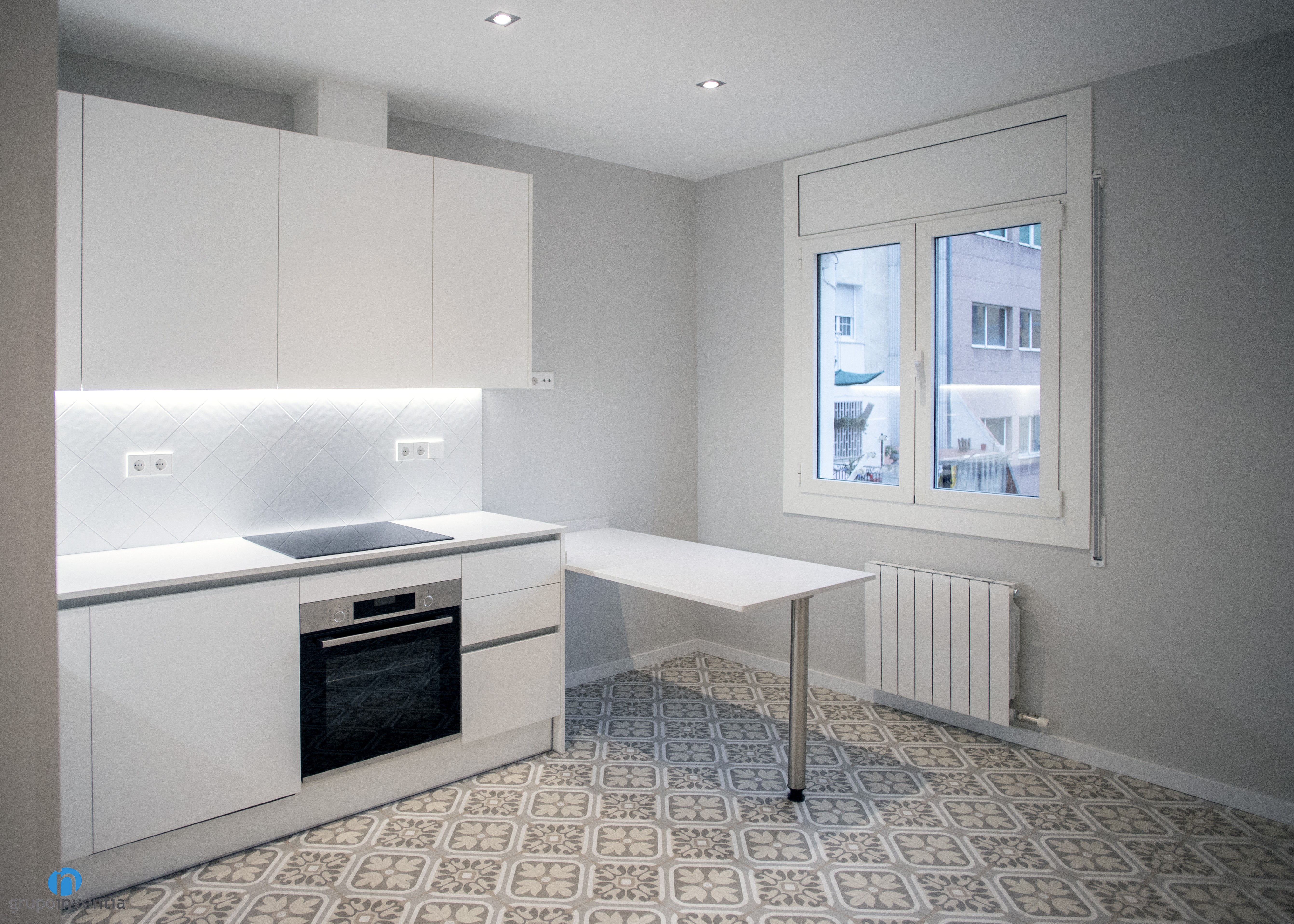 A la cuina es segueix el disseny contemporani que es va voler aplicar a l’habitatge, amb els colors neutres com a protagonistes. Tant el moble de cuina com els taulells són de color blanc, destacant així el paviment hidràulic que es va col·locar.