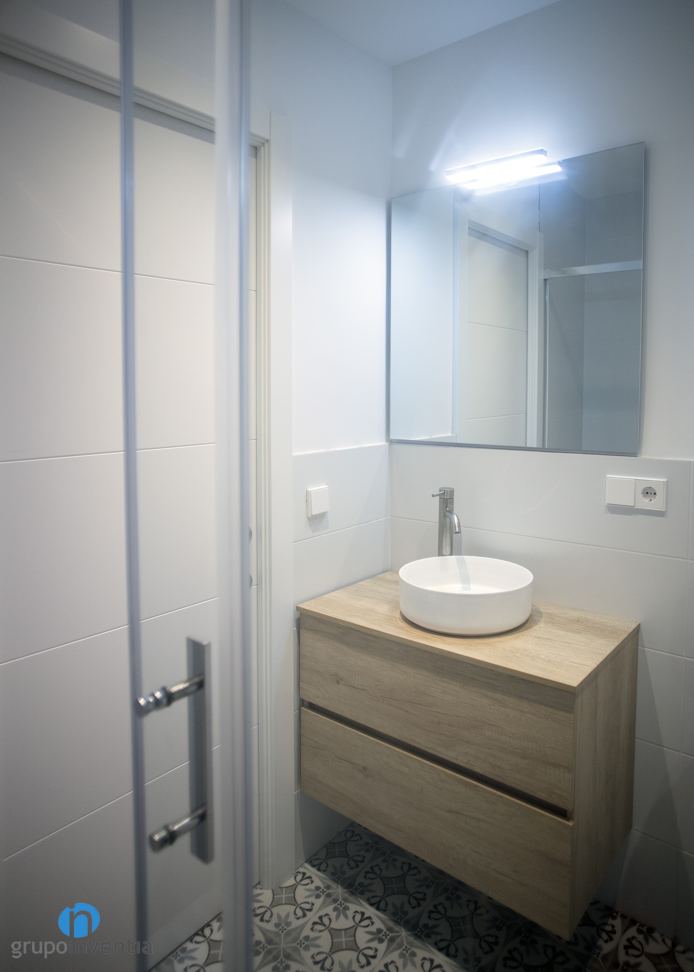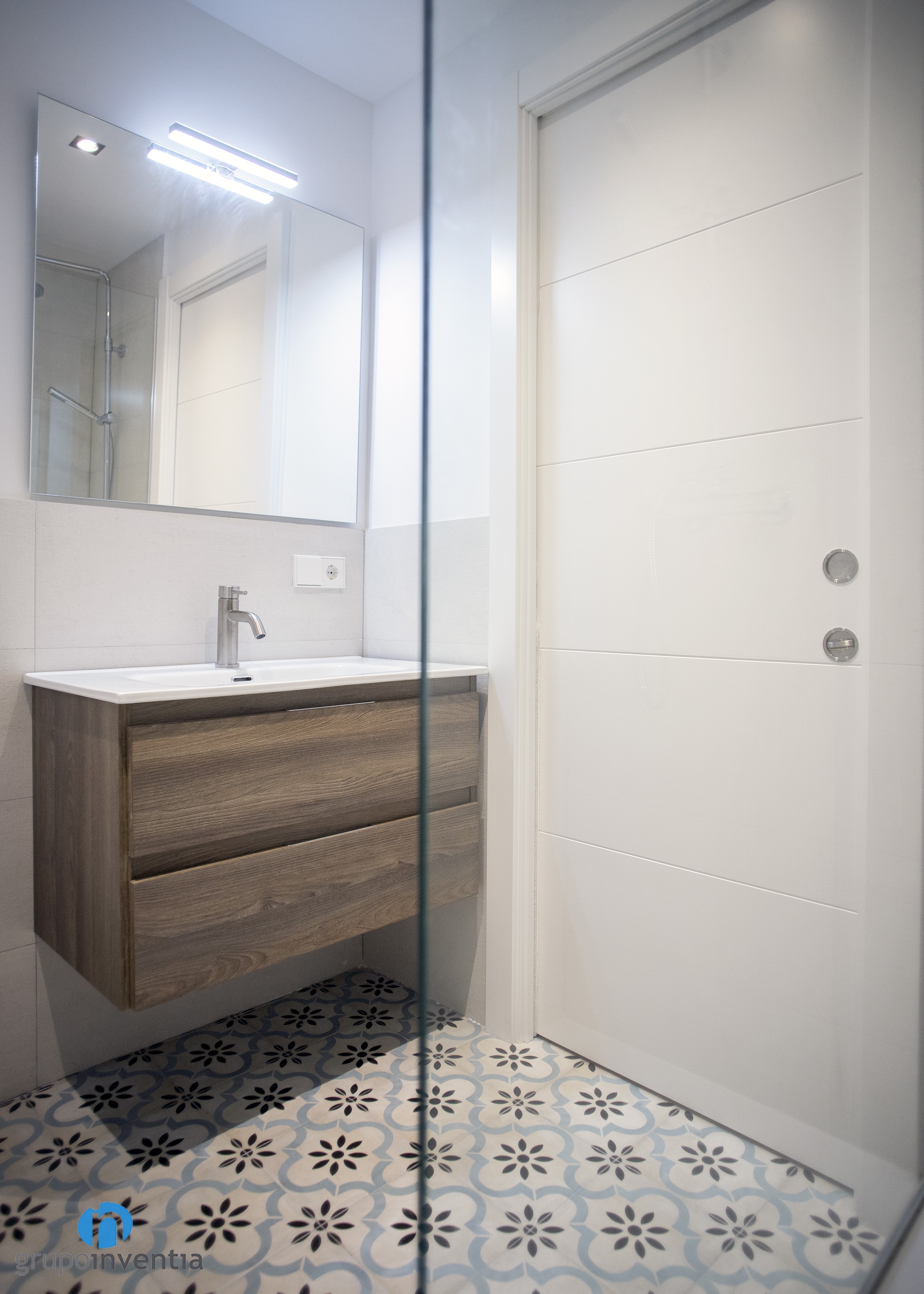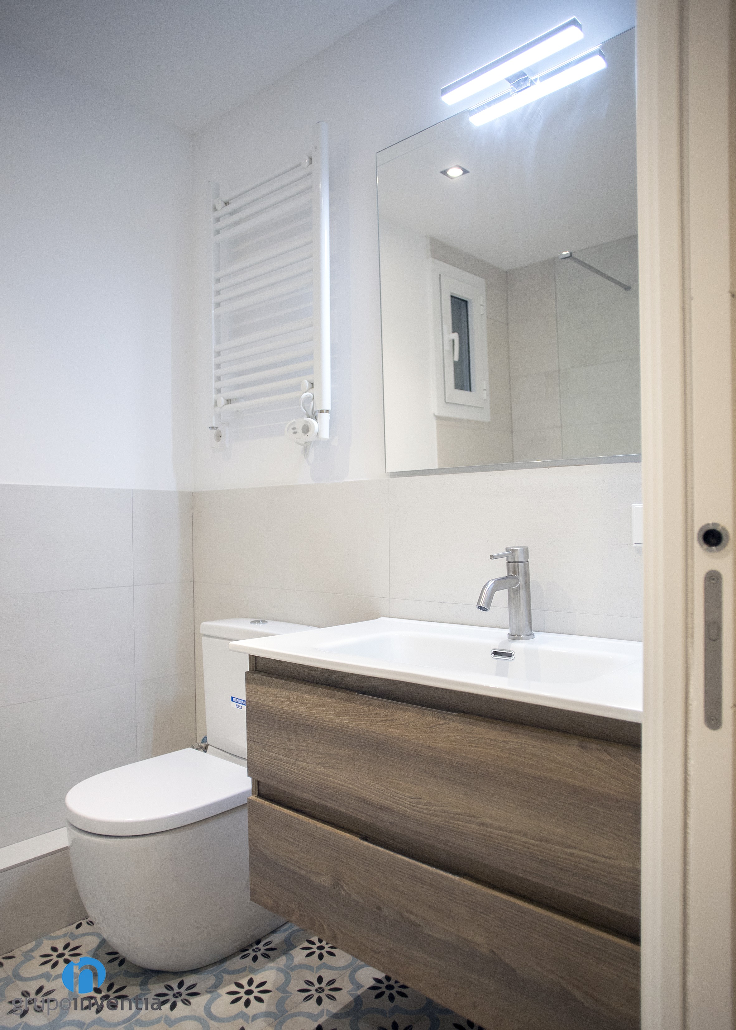 En tots dos banys es va apostar per una imatge neutra i acollidora. Les parets es van enrajolar a mitja alçada amb rajoles blanques i es va pintar del mateix color la resta de paret fins al sostre. Aquest aspecte permet incorporar un altre tipus d’acabats, com la fusta del moble del lavabo o el sòl hidràulic que es va col·locar en els dos banys.