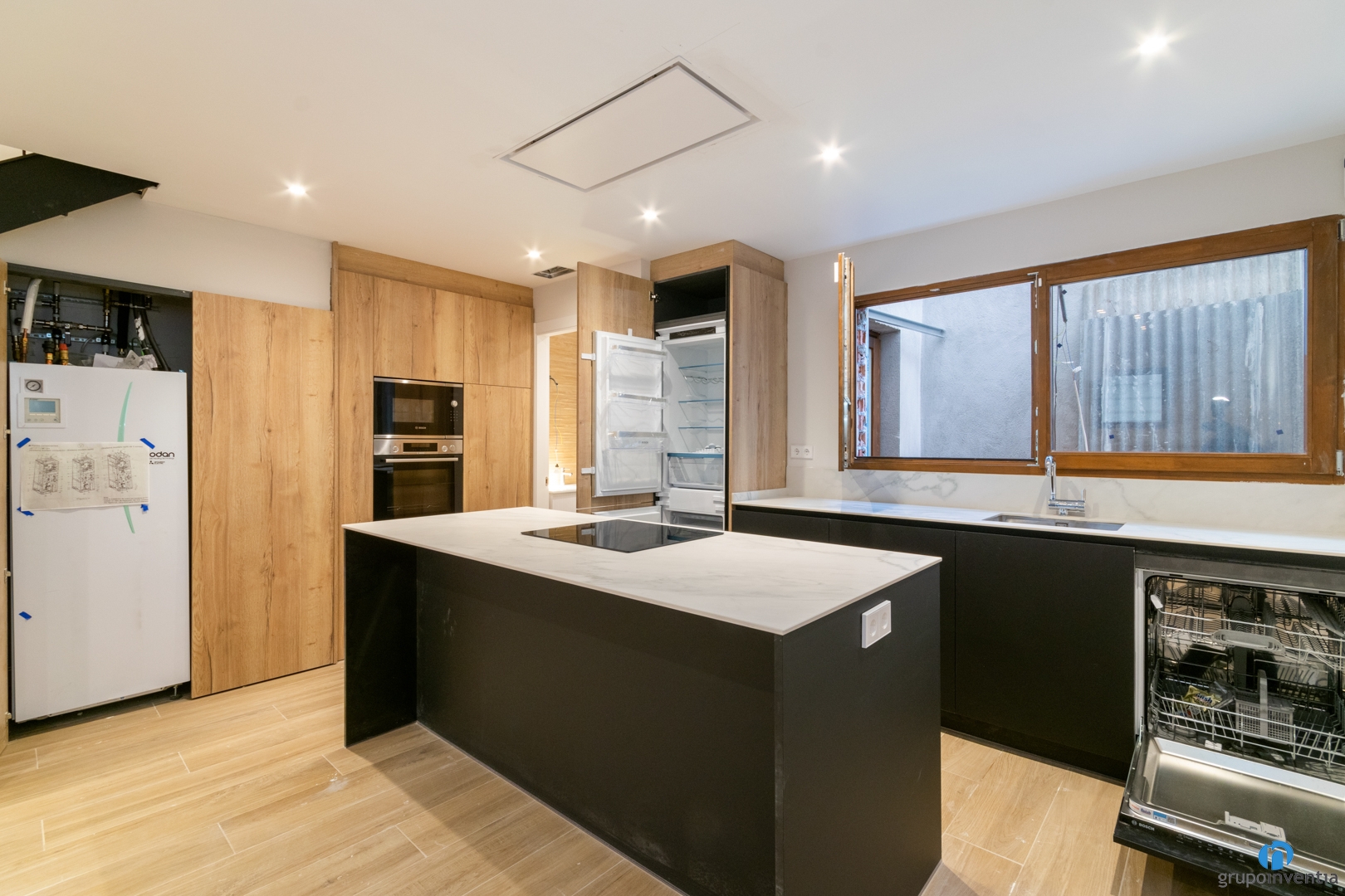 Pel que fa al disseny, aquesta cuina d’obra nova combina el color negre amb acabats de fusta. D’aquesta manera queda intgerada a l’habitatge, encara que definint visualment el seu espai.