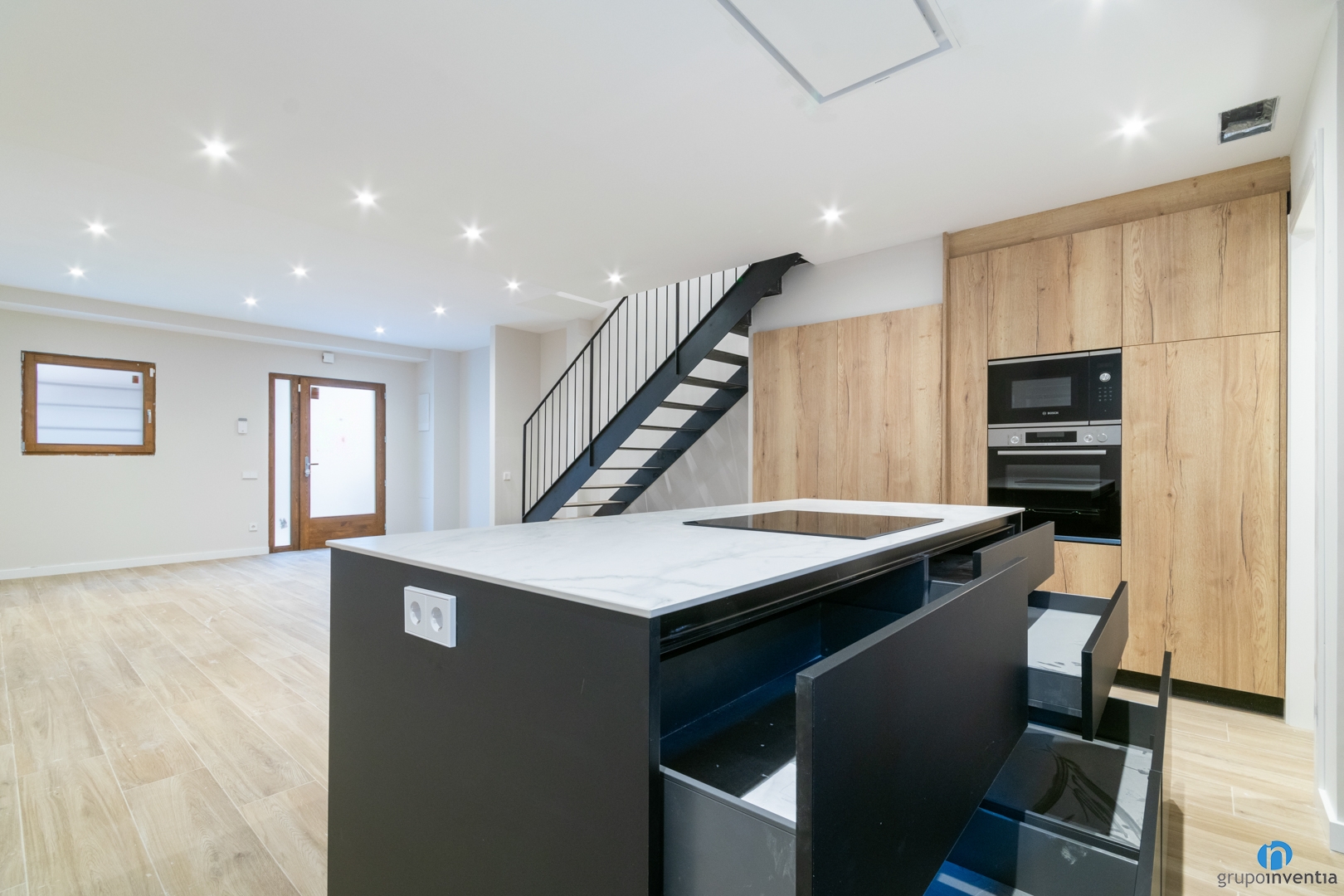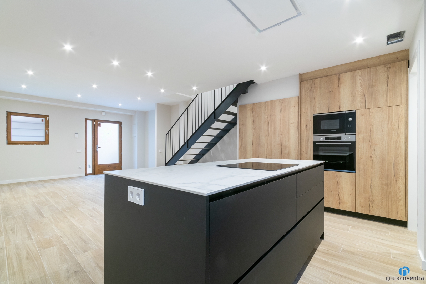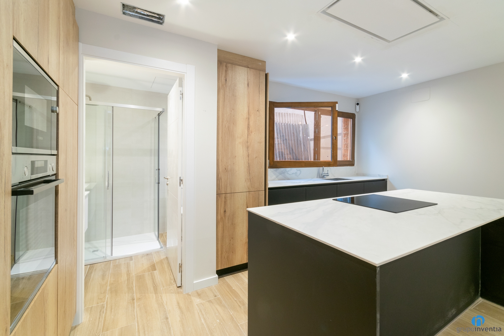 Just davant tenim una illa de cuina amb una placa d’inducció. A més de ser un espai per cuinar, té una funció doble. També es pot utilitzar com a barra d’esmorzar. A la paret de l’esquerra hi trobem un armari encastat amb el forn i el microones integrats.