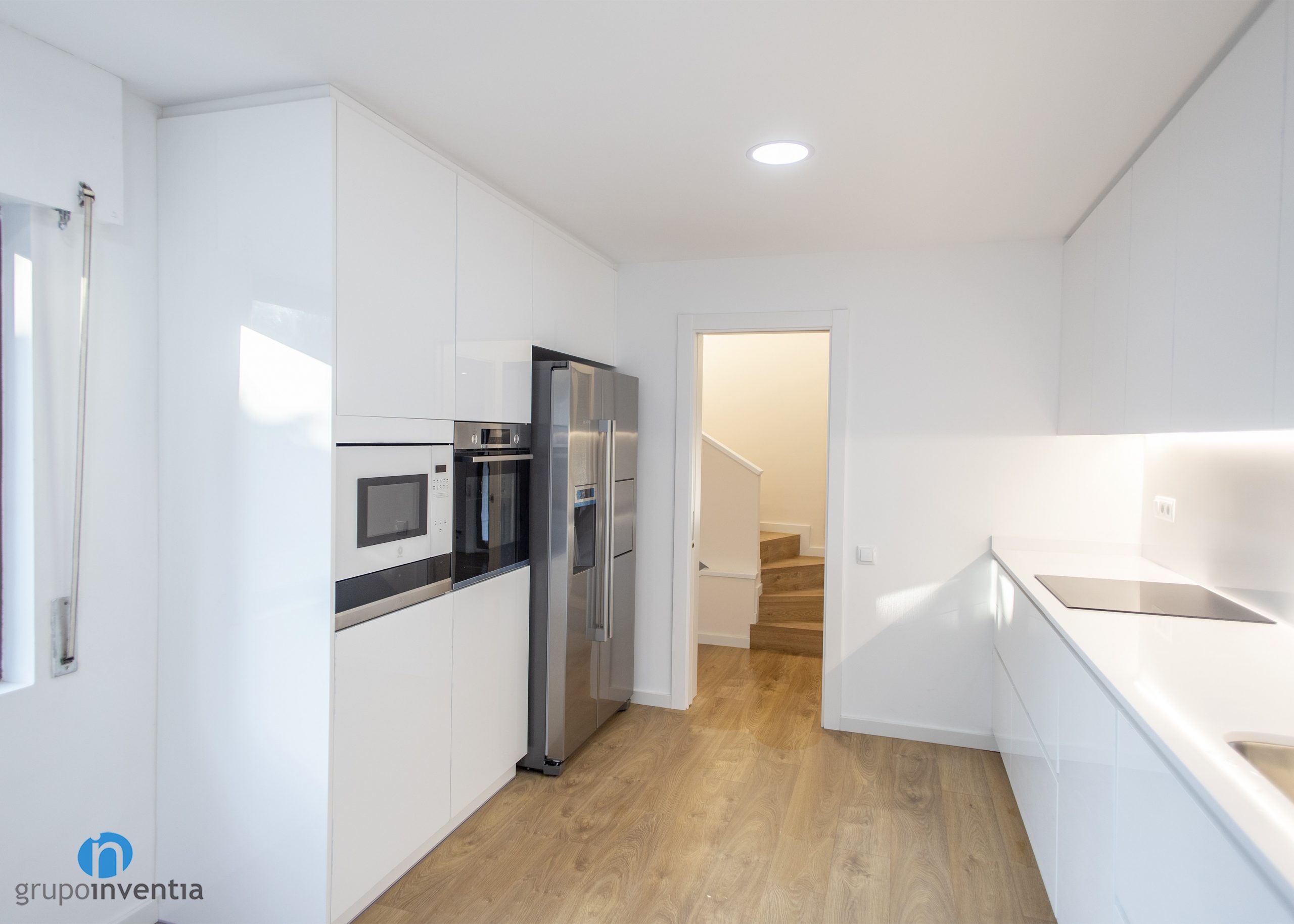 A la part dreta de l’entrada s’ha col·locat un moble de cuina en el qual s’han encastat la nevera, el forn i el microones. Just davant s’ha disposat una allargat taulell que ofereix una àmplia superfície de suport i de treball i que està equipat amb una placa vitroceràmica i una pica. Tant la part inferior com superior disposa de calaixos i armaris per a l’emmagatzematge a la cuina.