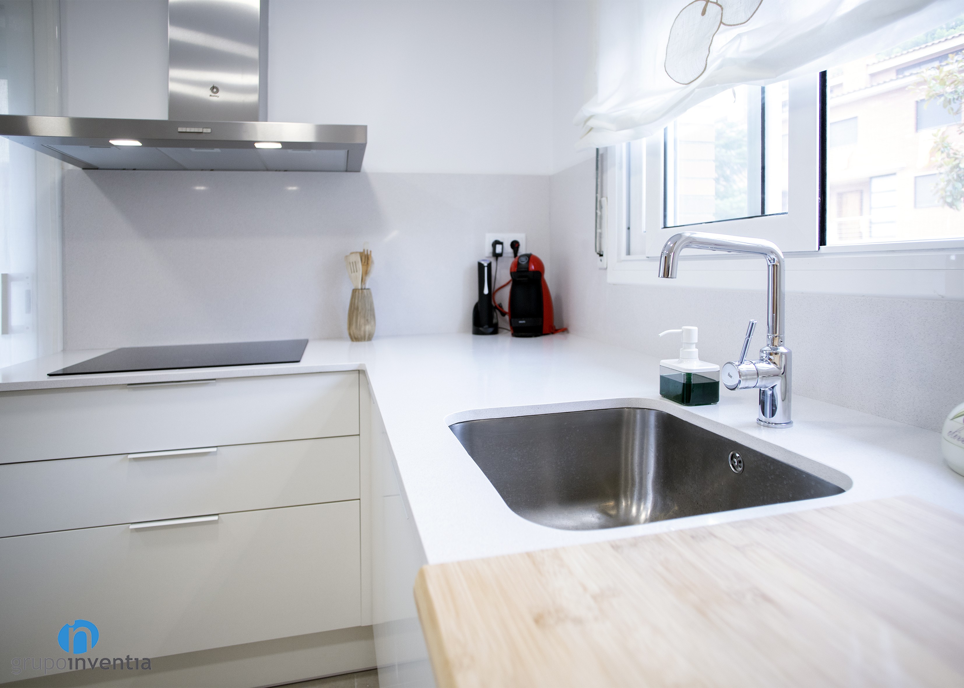 La cuina s’ubica en una estança pròpia i àmplia. En aquesta es distribueixen els nous elements a través d’un moble de cuina en forma de L. A la part esquerra de l’estança es va col·locar un primer tram de taulell sobre el qual es va instal·lar la placa vitroceràmica. El moble torça cap a la dreta per donar pas a una gran taulell que ofereix una àmplia superfície de suport i de treball i que es va equipar amb la pica.