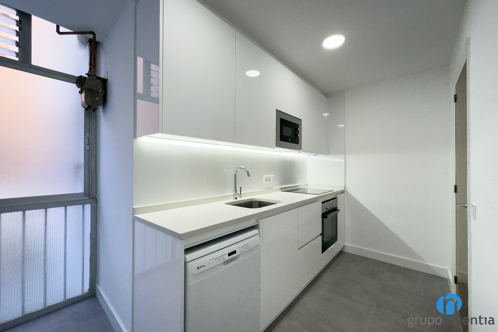 Tot plegat embolicat en un moble de cuina blanc, igual que les parets. A la cuina també s’ha aconseguit generar més sensació d’amplitud i lluminositat. Un ambient ideal per a una zona d´ús diari. Fins i tot al fons hi ha un espai de galeria on s’han col·locat la nevera i la rentadora.