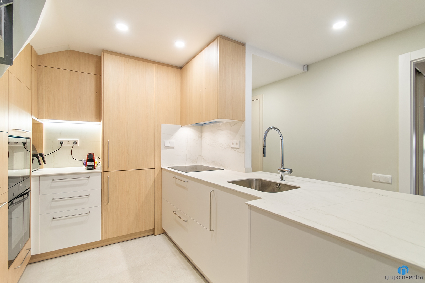 El costat dret és la zona principal de treball. Té una encimera àmplia equipada amb placa d’inducció i un aigüera d’un sol si. Aquesta encimera també funciona com a barra de cuina. És perfecta per esmorzars, àpats ràpids o per conversar mentre es cuina. El resultat és una cuina moderna i funcional, preparada per a l’ús diari.