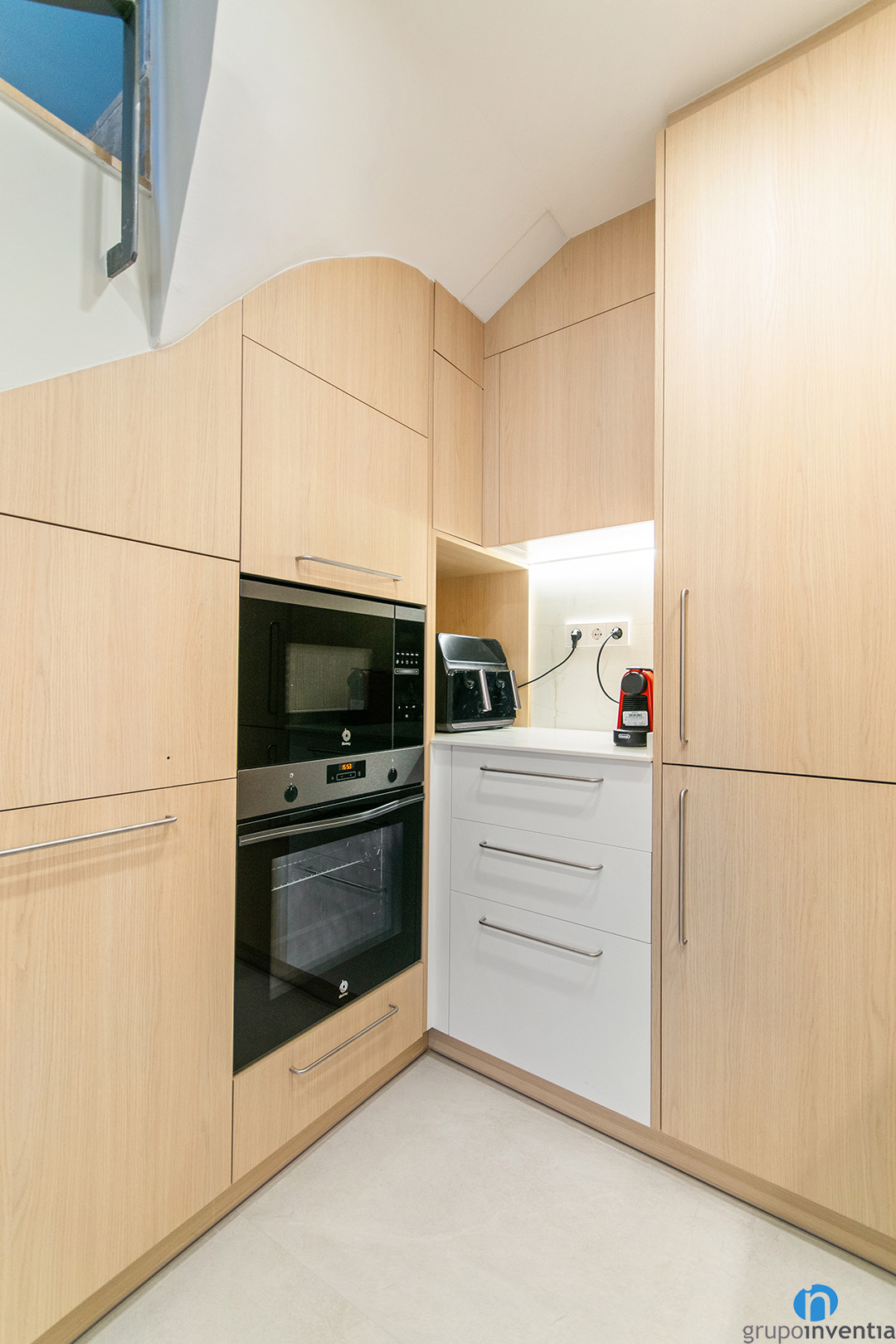 Al costat esquerre hem col·locat diversos armaris de gran capacitat. Són mobles de diferents mides que faciliten una bona organització. En aquest mateix costat hem integrat el forn i el microones. Queden molt accessibles i milloren l’ús diari de l’espai.