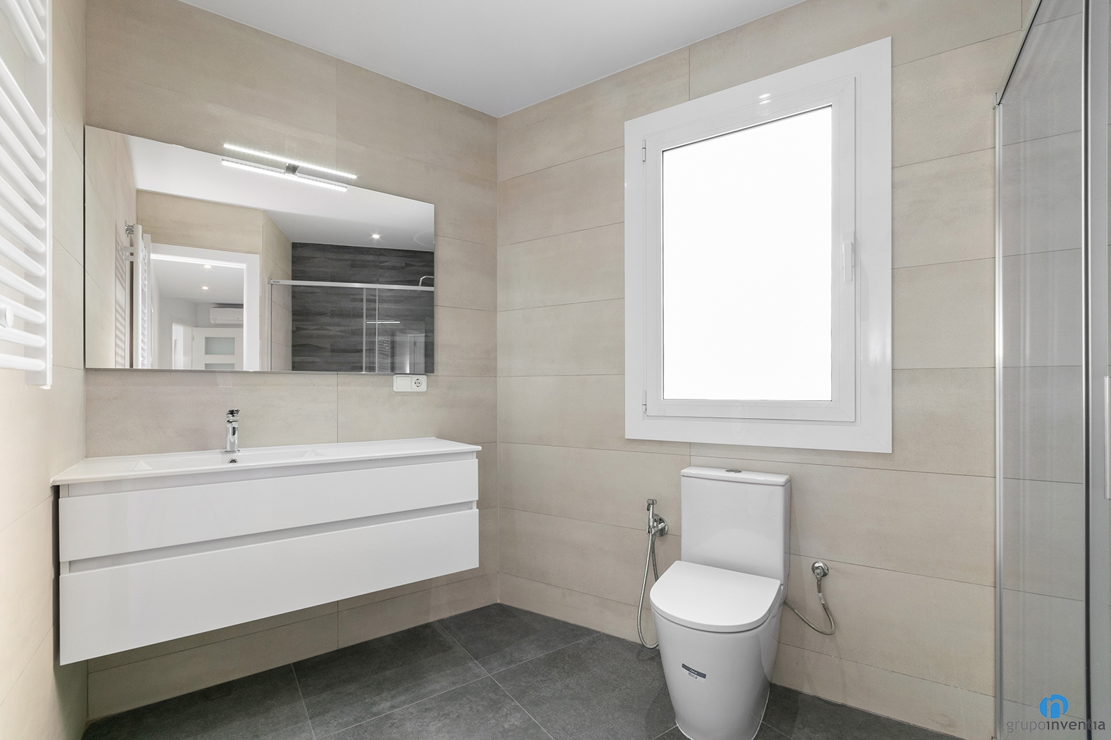 Al final del passadís ens trobem la nova cambra de bany. És ampli i compta amb un equipament sanitari complet. Ens hem encarregat d’instal·lar-hi un plat de dutxa, un vàter amb suple bidet i un lavabo amb moble de dos calaixos. Es tracta d’un espai de neteja preparat per oferir les millors prestacions.