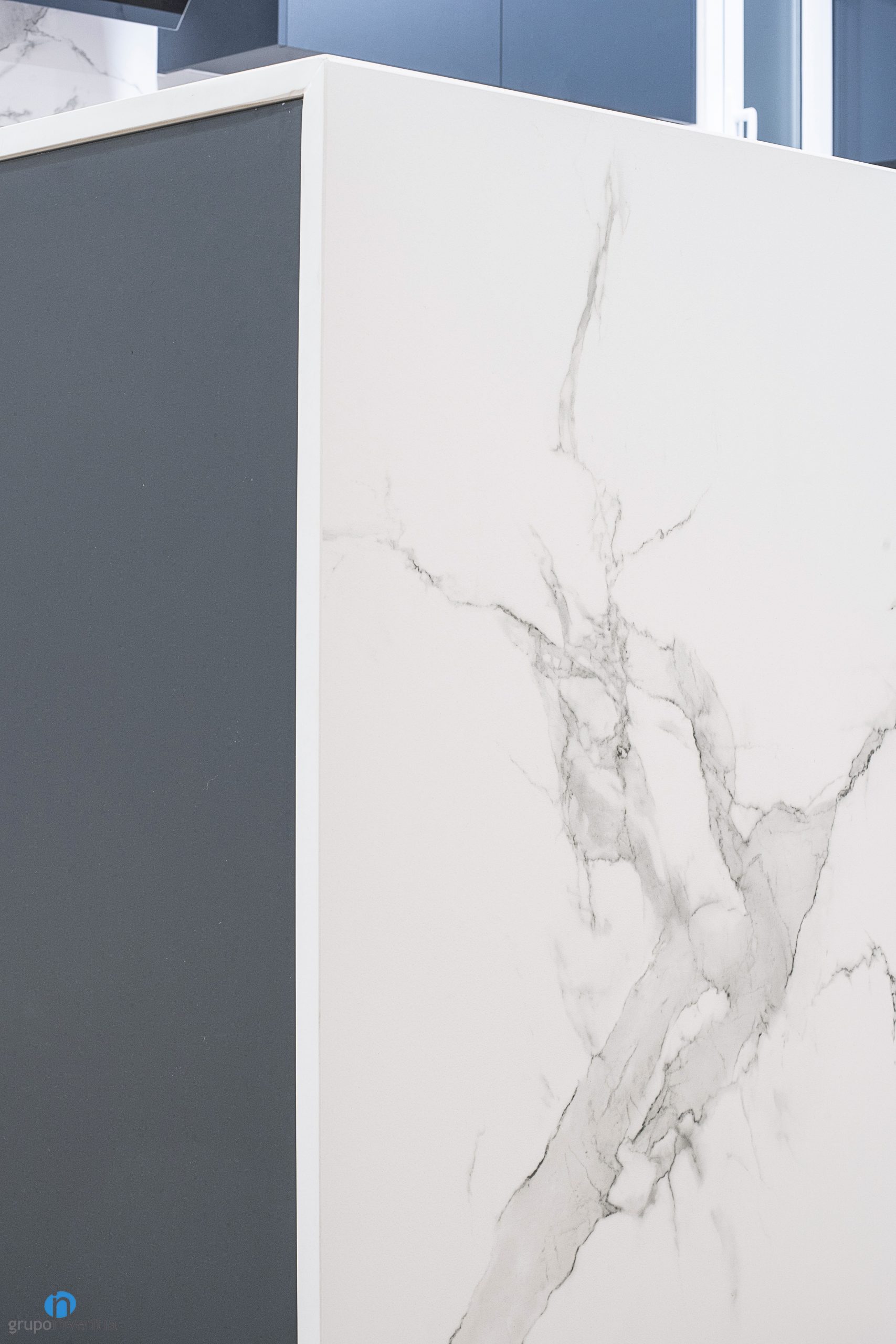 A la part dreta s’han integrat una nevera americana, un forn i un microones. La part central l’ocupa un taulell de silestone blanc en la qual s’ha instal·lat una pica integrat i una placa vitroceràmica. A aquesta l’acompanya una campana extractora decorativa. El costat esquerre l’ocupa una altra de sobre que amplia la superfície de suport i de treball en aquesta cuina. A més de tot això, la zona inferior de les taulells està equipada amb diversos calaixos i armaris per a l’emmagatzematge.
