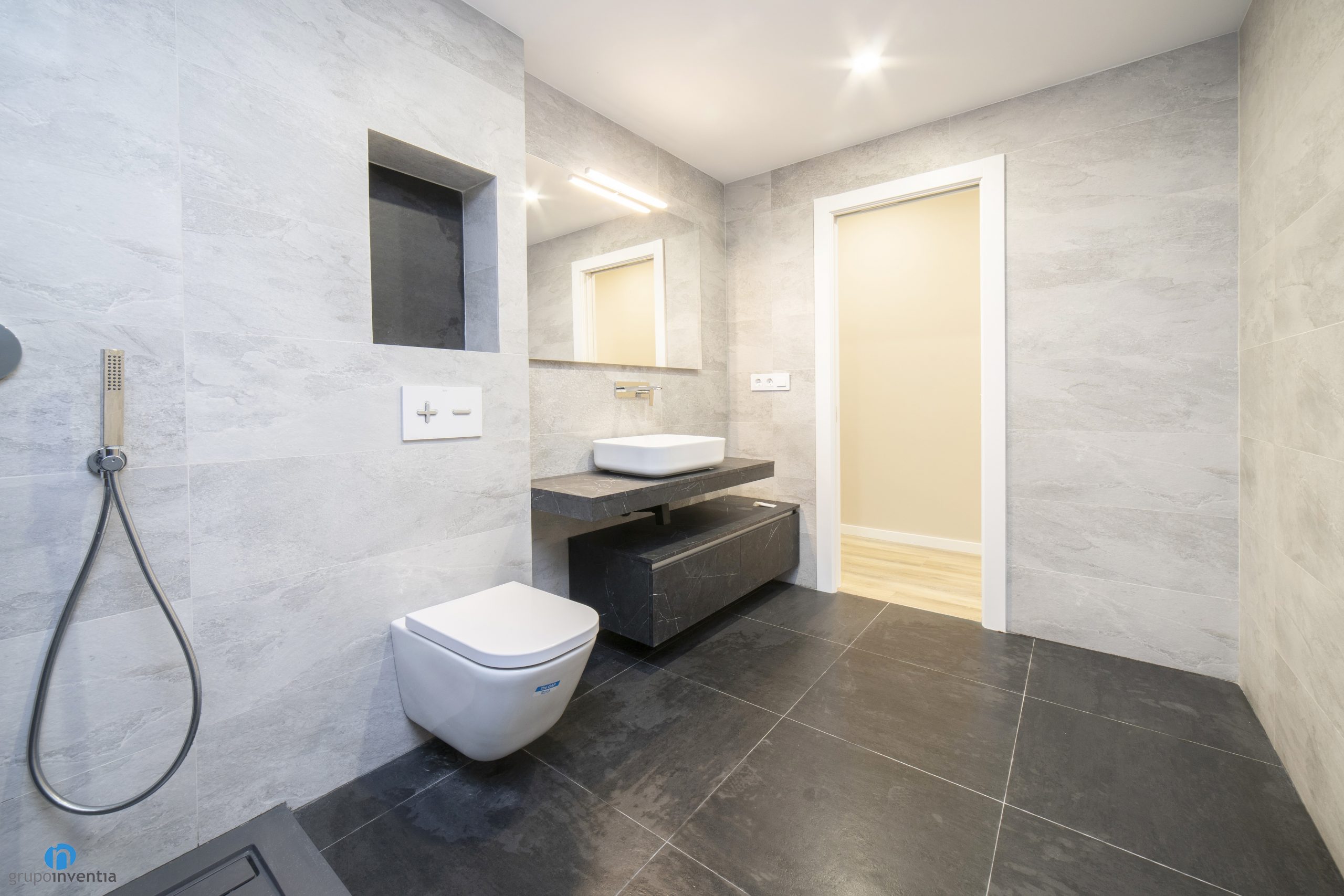 En aquesta reforma integral a Barcelona s’ha dut a terme la rehabilitació de dues cambres de bany. S’ha utilitzat un disseny interior diferent en cada un d’ells, però ara tots dos compten amb un equipament sanitari nou i de garanties. Cada bany disposa d’un lavabo amb moble d’emmagatzematge incorporat, un vàter flotant i una zona d’aigües. En aquest últim cas al bany principal s’ha instal·lat un plat de dutxa. Per la seva part en el bany de cortesia s’ha mantingut l’espai de la banyera.