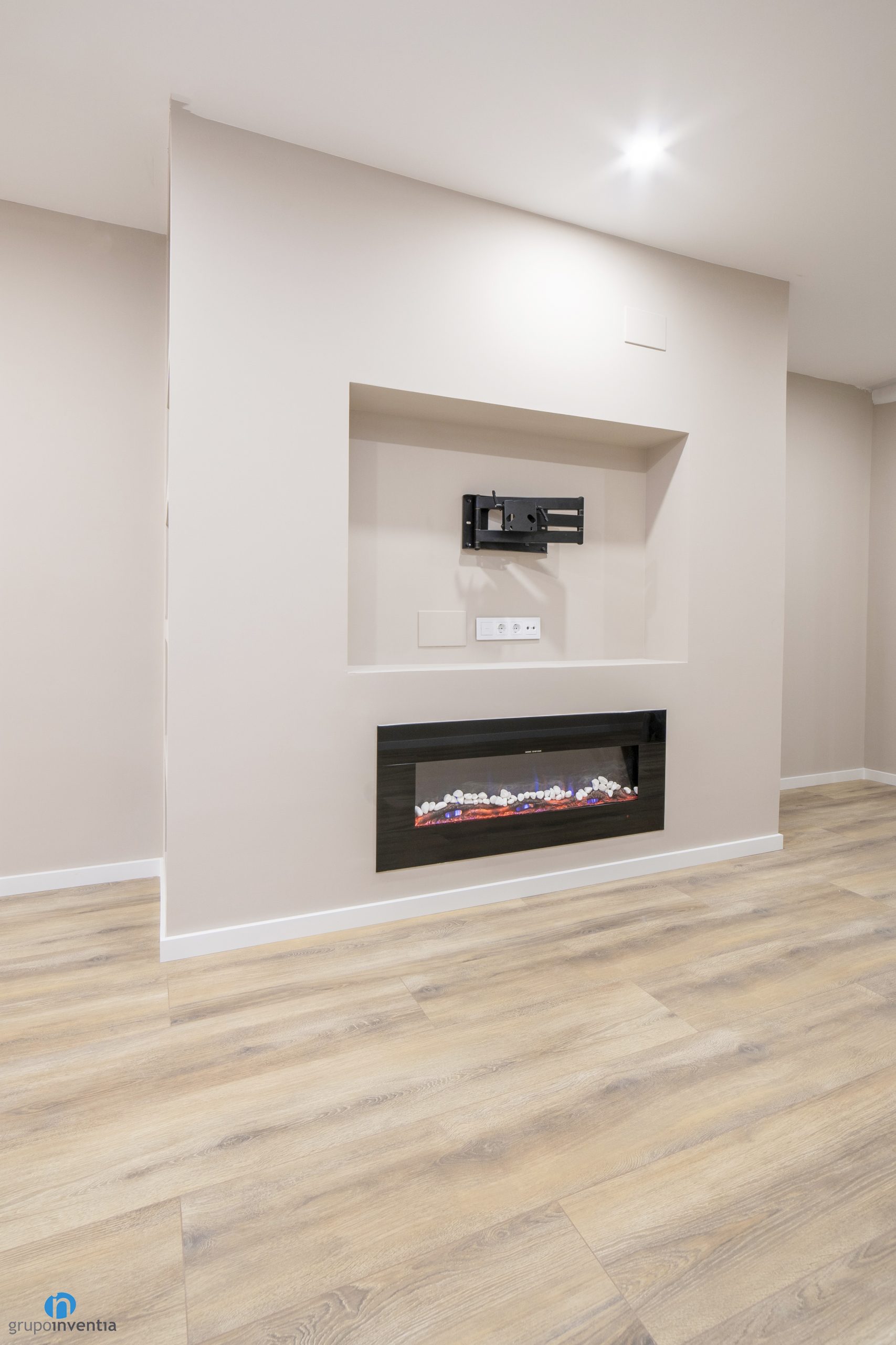 Un altre detall de la nova imatge i equipament en aquesta reforma integral el trobem en el paviment. En la majoria es la superfície s’ha col·locat un terra ceràmic imitació parquet que contribueix a generar aquest disseny contemporani. Un altre detall interessant el trobem a la sala d’estar, on s’ha mantingut i renovat la xemeneia.