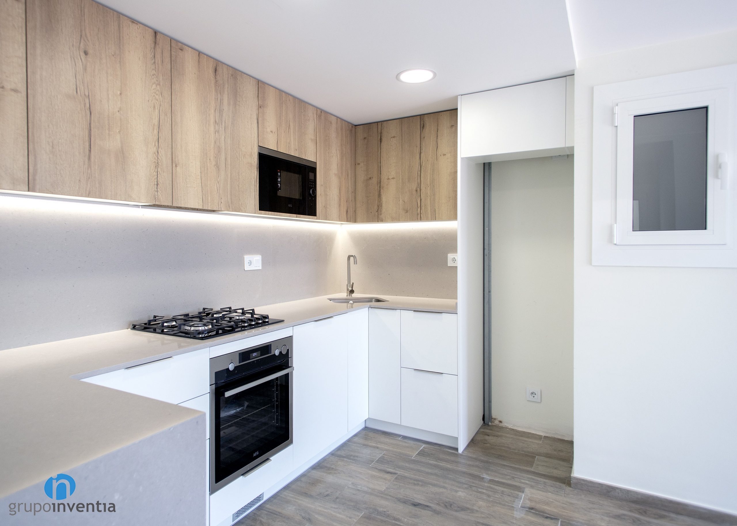 El taulell torça cap a la dreta i dóna pas a un nou tram equipat amb una pica. Ja a l’extrem s’ha disposat un buit a mida per encastar la nevera. La imatge d’aquesta cuina segueix la línia decorativa general d’aquesta reforma integral. La part inferior del moble de cuina és de color blanc i la superior presenta acabats en fusta. Una cosa que combina amb el terra de parquet.