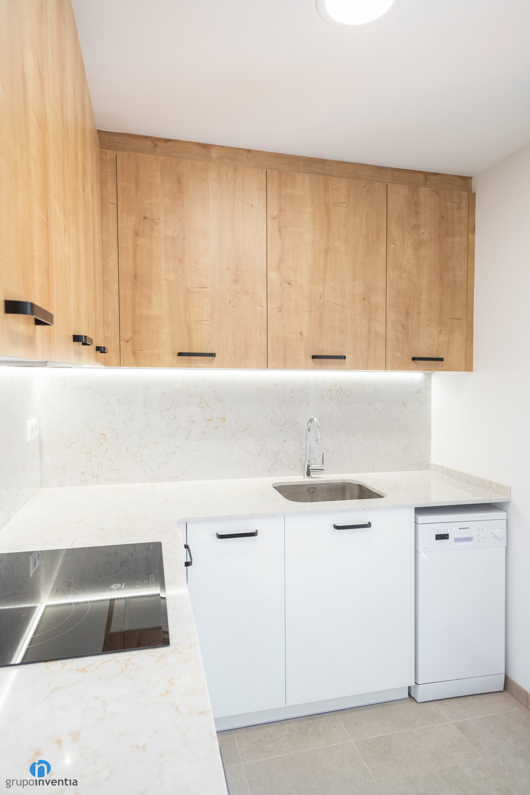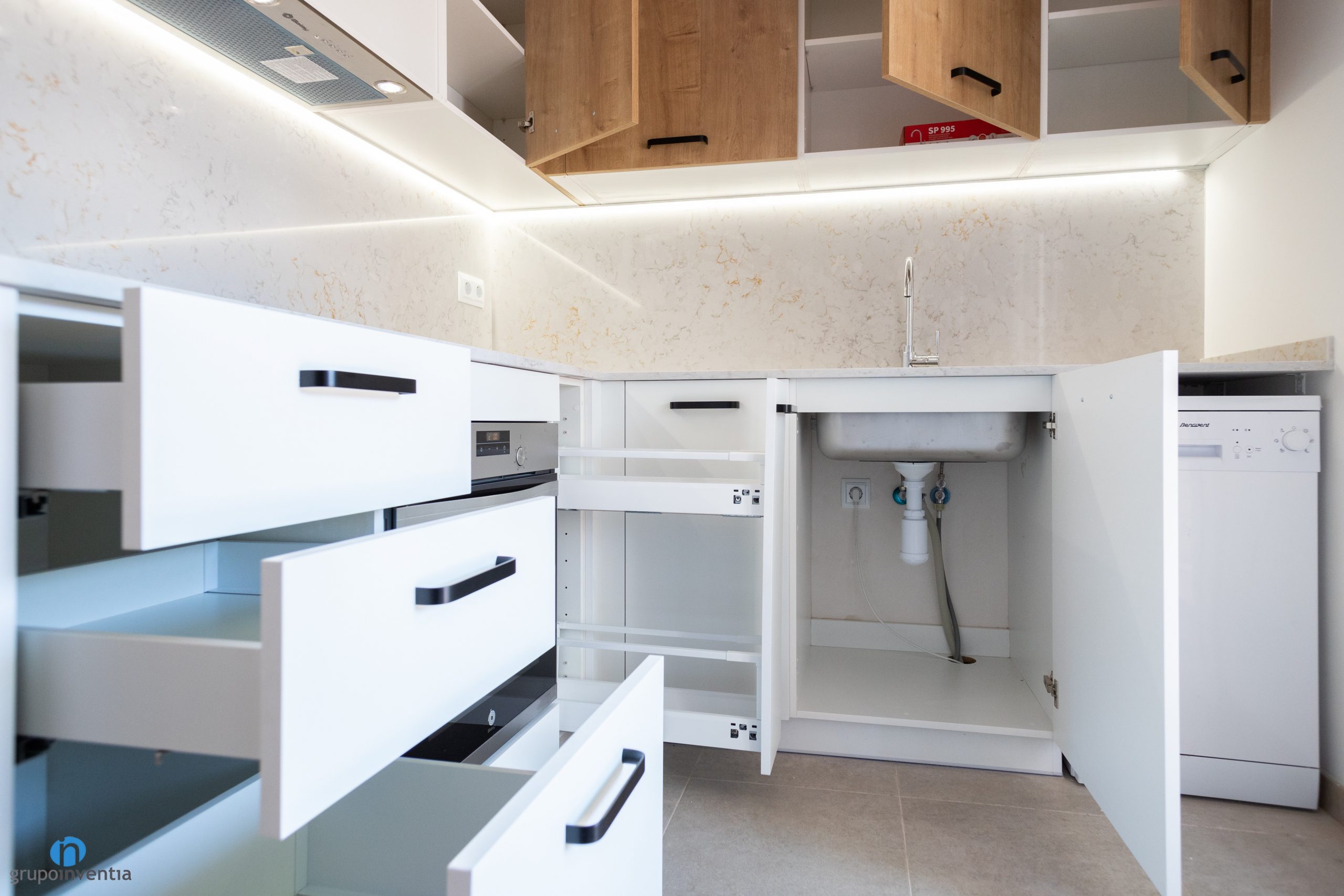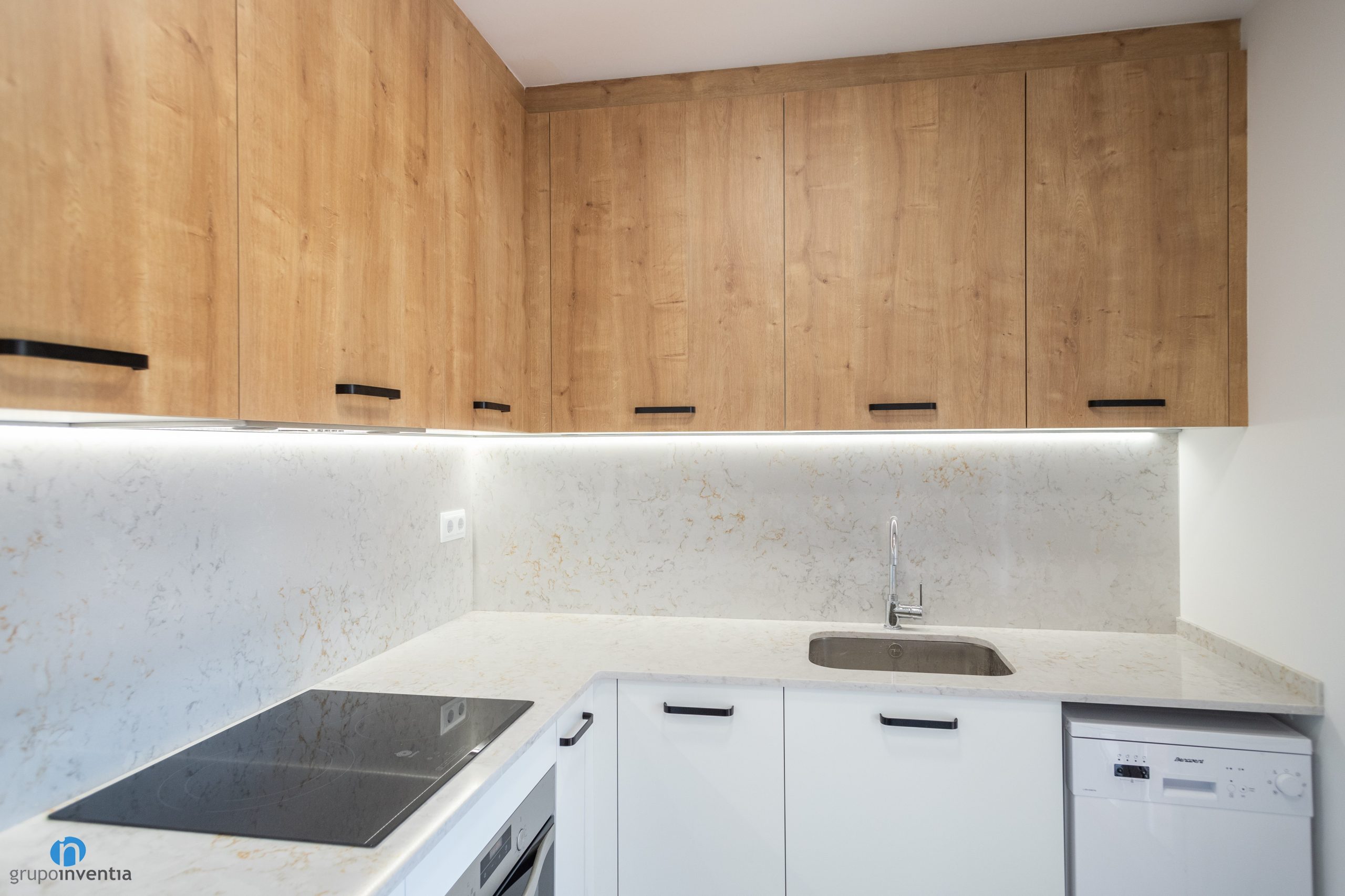 La cuina també compta amb una àmplia capacitat d’emmagatzematge. S’han col·locat diversos calaixos i armaris tant en la part baixa com alta de les taulells. El moble inferior es presenta en color blanc. Els armaris superiors llueixen un encertat acabat en fusta. En tots dos casos els tiradors són discrets i de color negre.