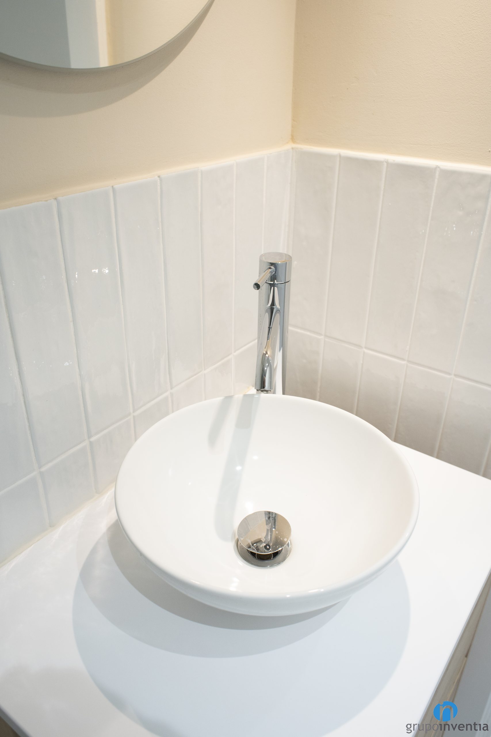 A la part dreta hem instal·lat un lavabo de disseny rodó sobre un moble amb dos calaixos per a l’emmagatzematge. D’aquesta manera, aconseguim que els productes d’higiene puguin estar perfectament organitzats. Tot seguit hem col·locat el vàter, de línies clàssiques i amb la cisterna col·locada a l’esquena.