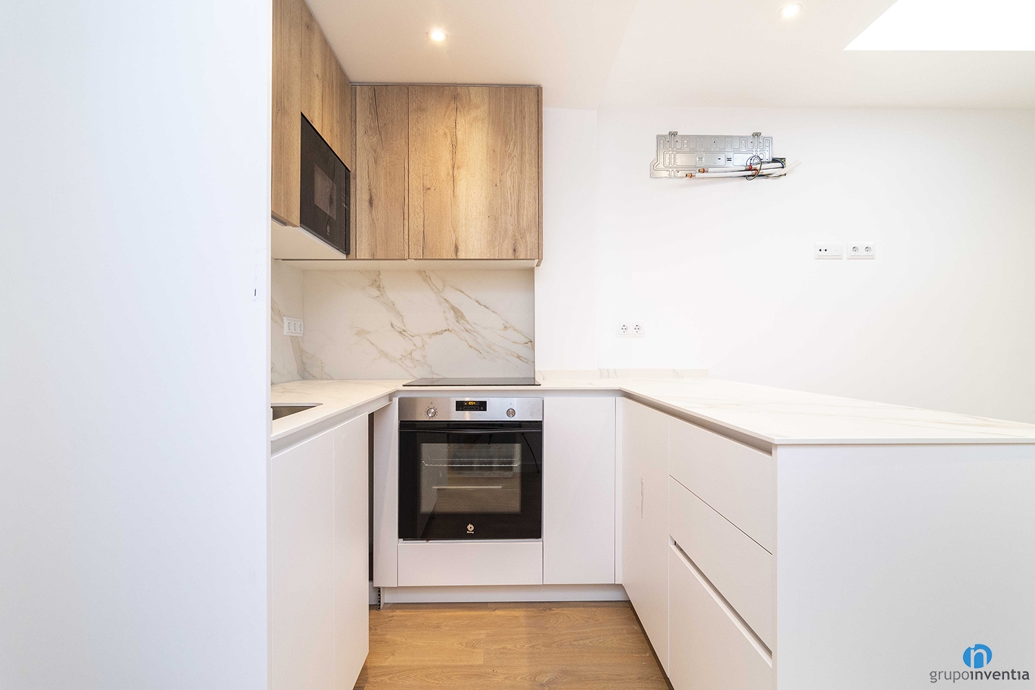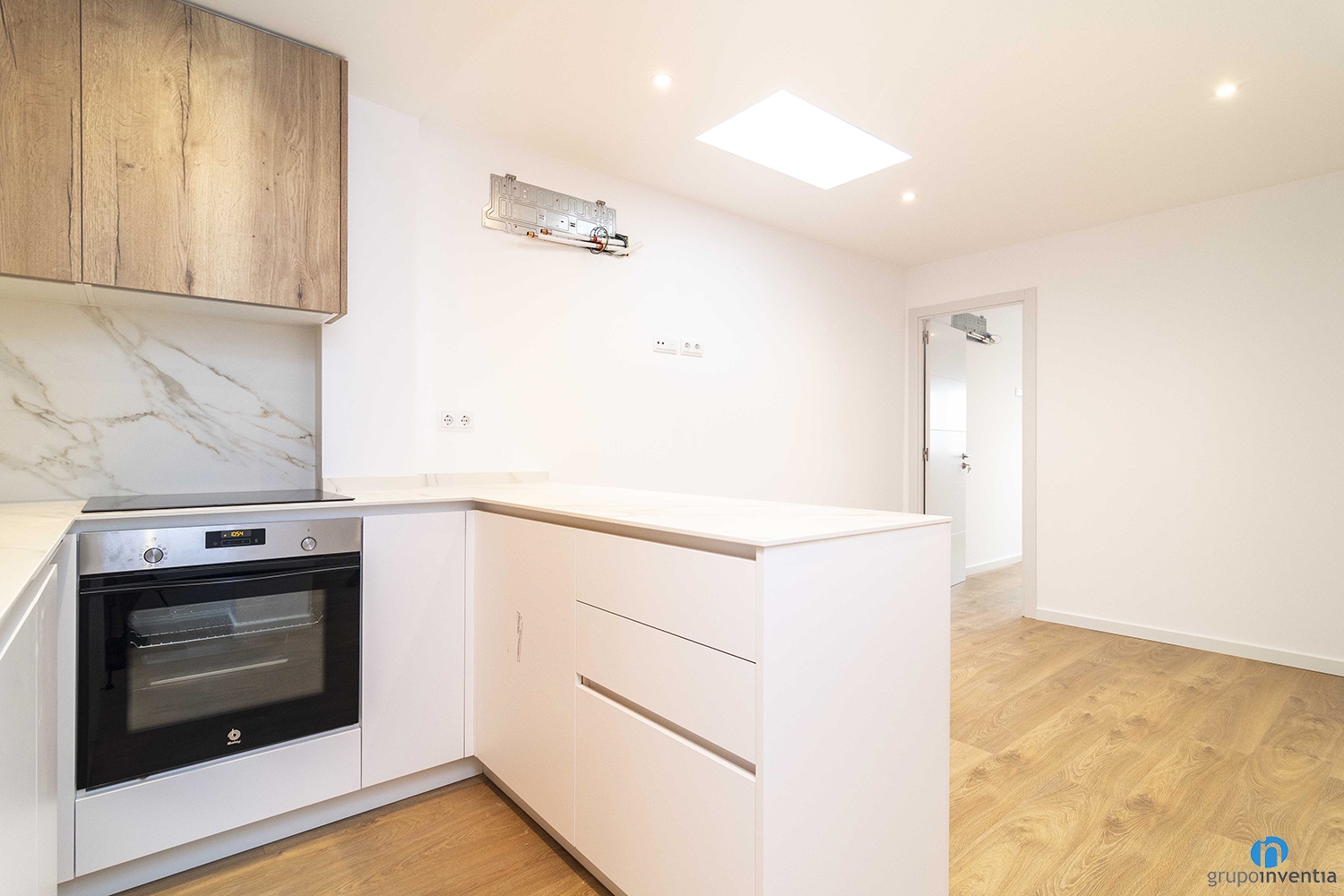 Pel que fa a les reformes de cuina, s’ha mantingut un disseny coherent i funcional en ambdós habitatges, amb diferències adaptades a l’espai disponible. A la planta baixa, la cuina es presenta oberta al saló, afavorint la connexió entre ambients i potenciant la sensació d’amplitud. Destaca per la combinació de mobles blancs a la part inferior amb armaris d’acabat en fusta natural a la superior, acompanyats per un elegant frontal de marbre vetejat.