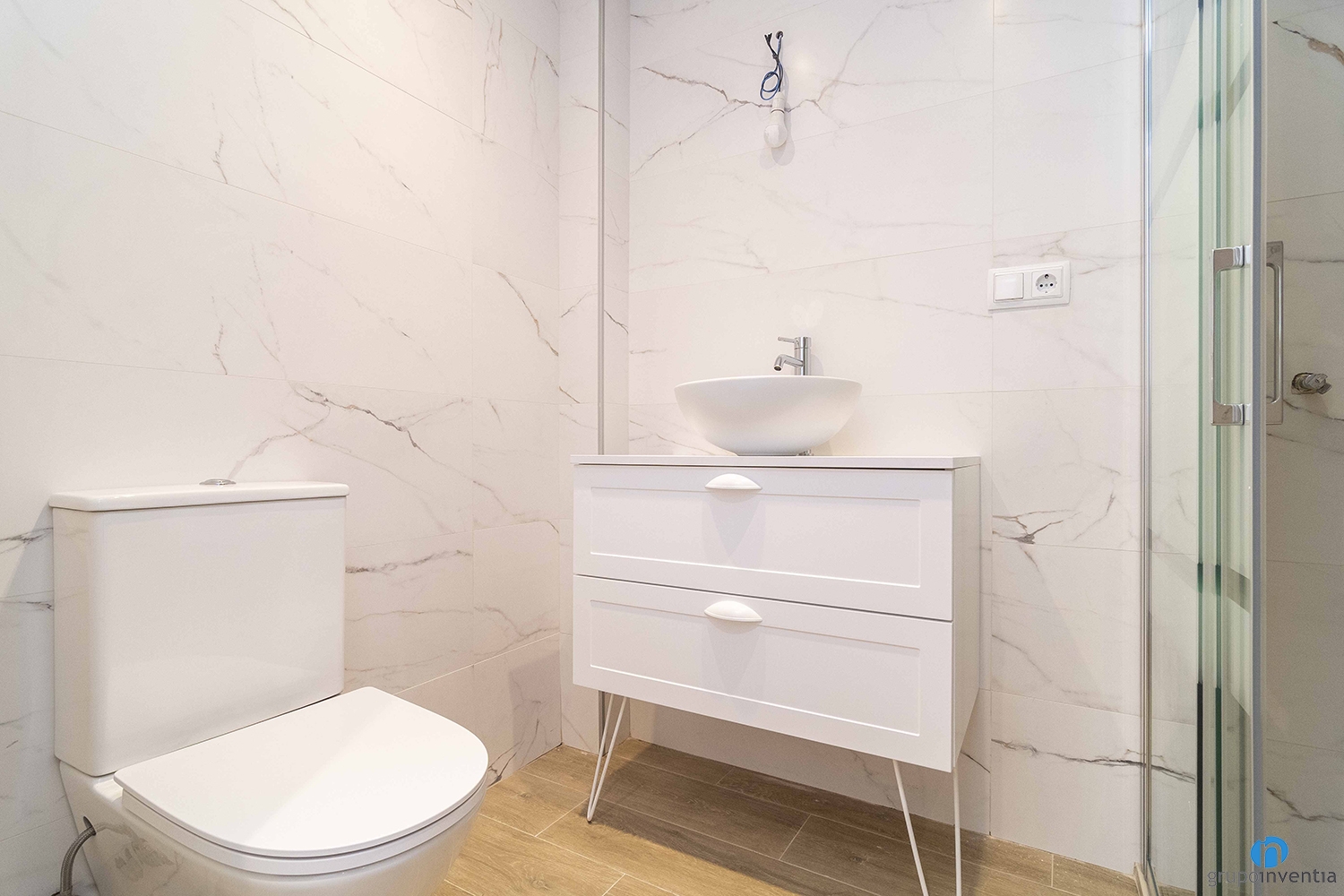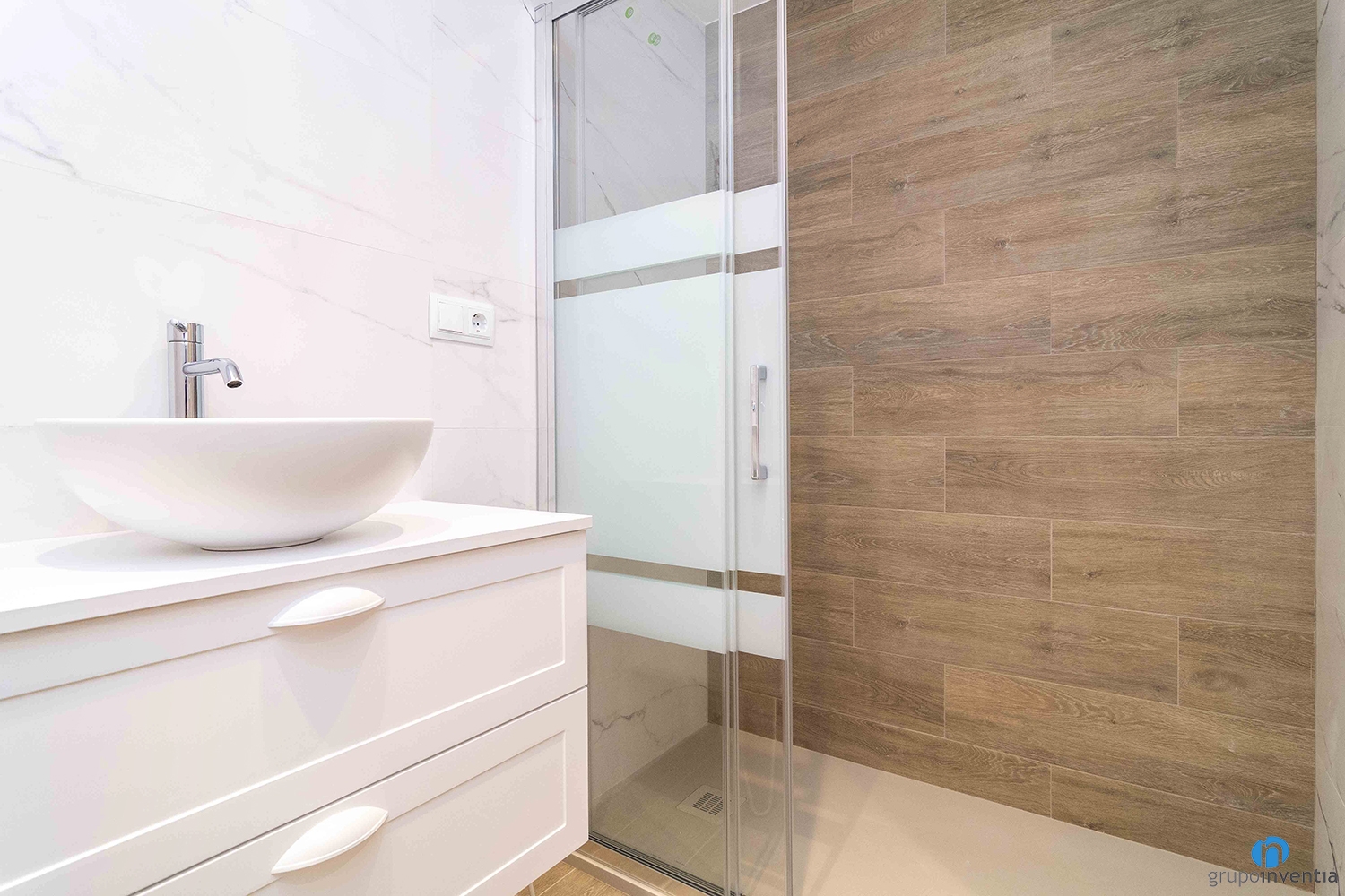 El bany d’ambdós habitatges també comparteix disseny: modern, elegant i funcional. El revestiment en marbre blanc amb vetes grises aporta lluminositat, mentre que els elements en fusta afegeixen un toc càlid i natural. La combinació d’aquests materials crea un ambient d’spa domèstic, pensat per al benestar.