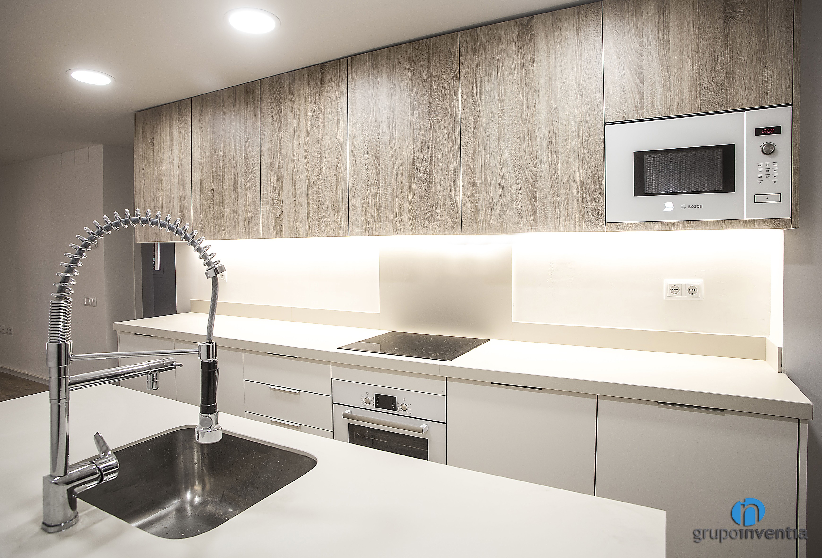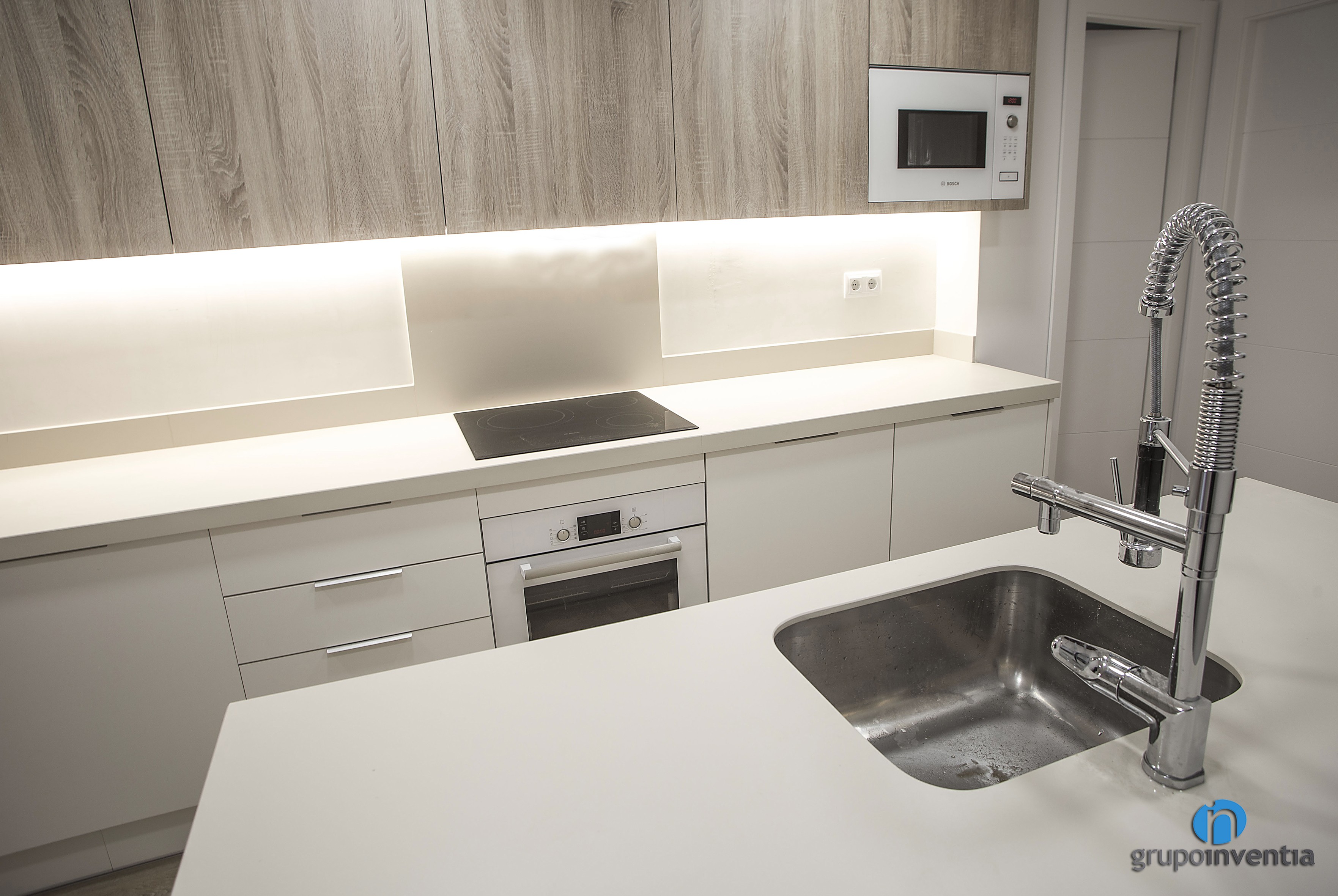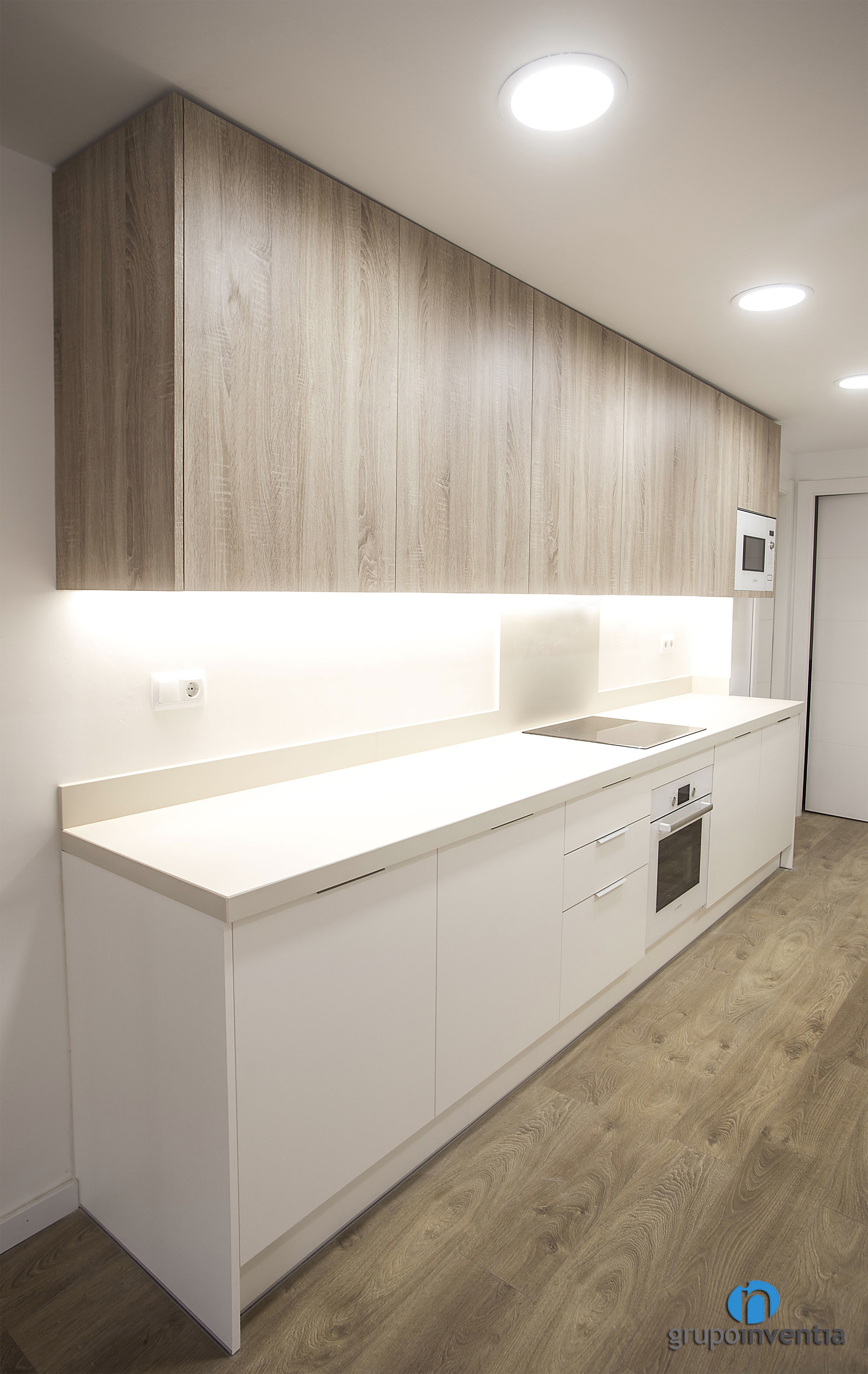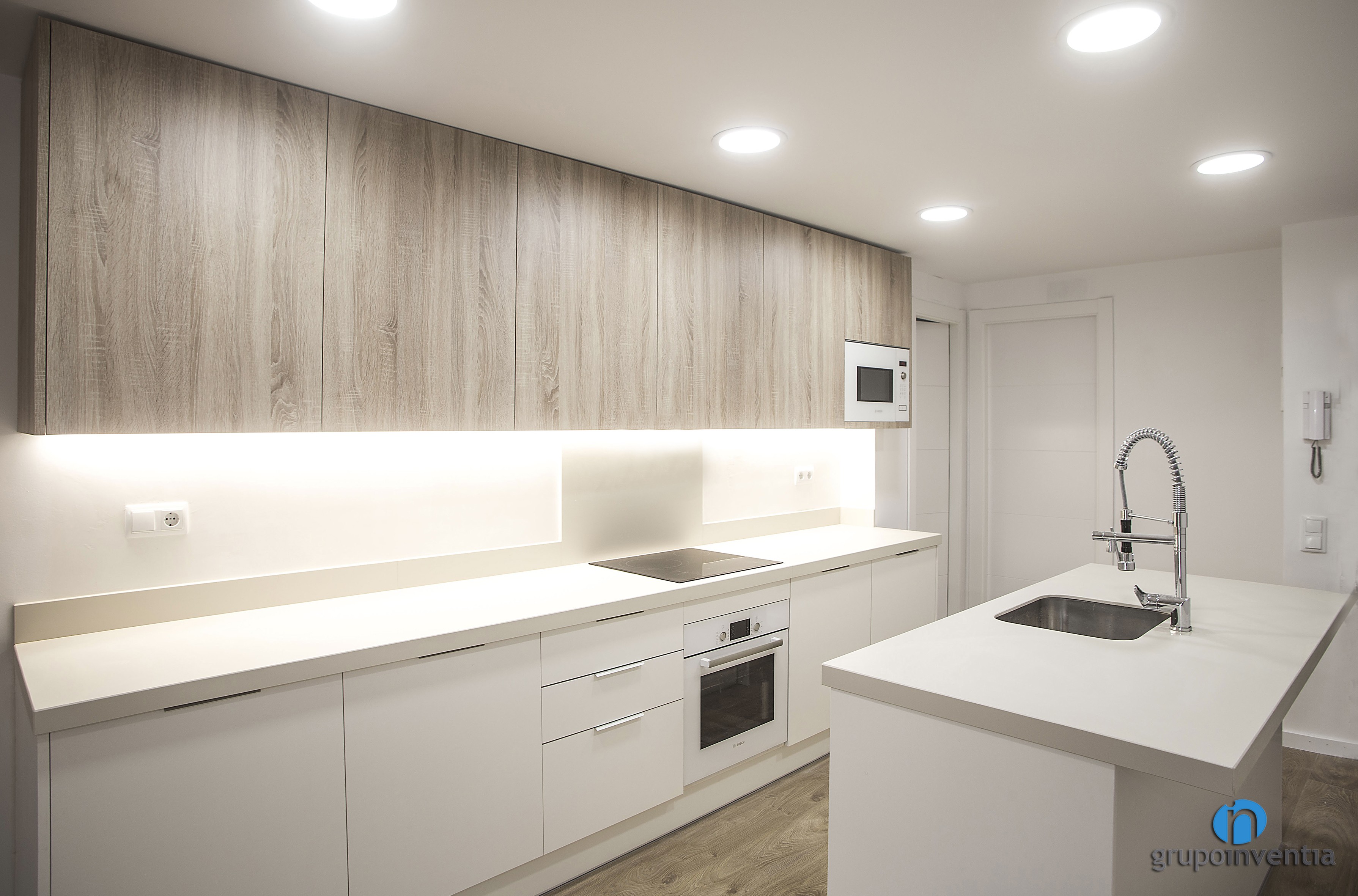 La reforma de cuina s’ubica en un espai obert i compta amb una distribució a dos fronts, sent un d’aquests una illa de cuina. A la part esquerra es va col·locar un àmpli taulell que compta amb capacitat d’emmagatzematge tant en la seva part inferior com superior, on es van encastar el forn i el microones respectivament. Al seu torn, aquesta taulell està equipat amb una placa vitroceràmica.