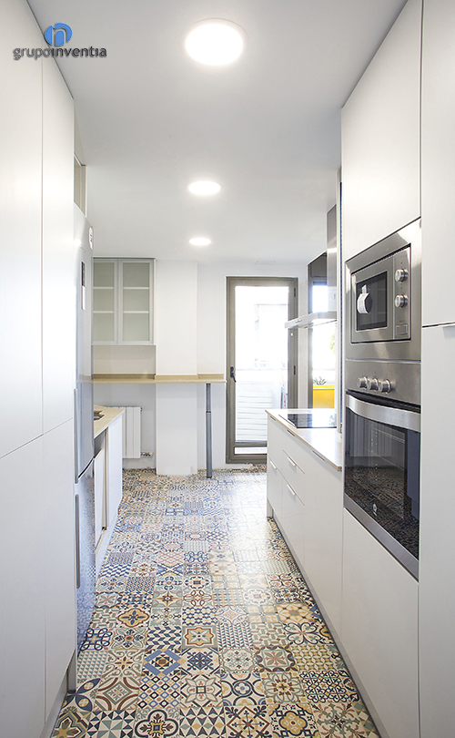Un altre punt característic d’aquesta reforma de cuina és el terra. Per a ell es va utilitzar un paviment hidràulic que li aporta personalitat i color a una estança en la qual predominen els tons neutres. Un altre detall d’aquest nou treball és que en el fons de la cuina es va col·locar una barra que, habilitada amb tamborets, crea un espai perfecte per realitzar les ingestes diàries.