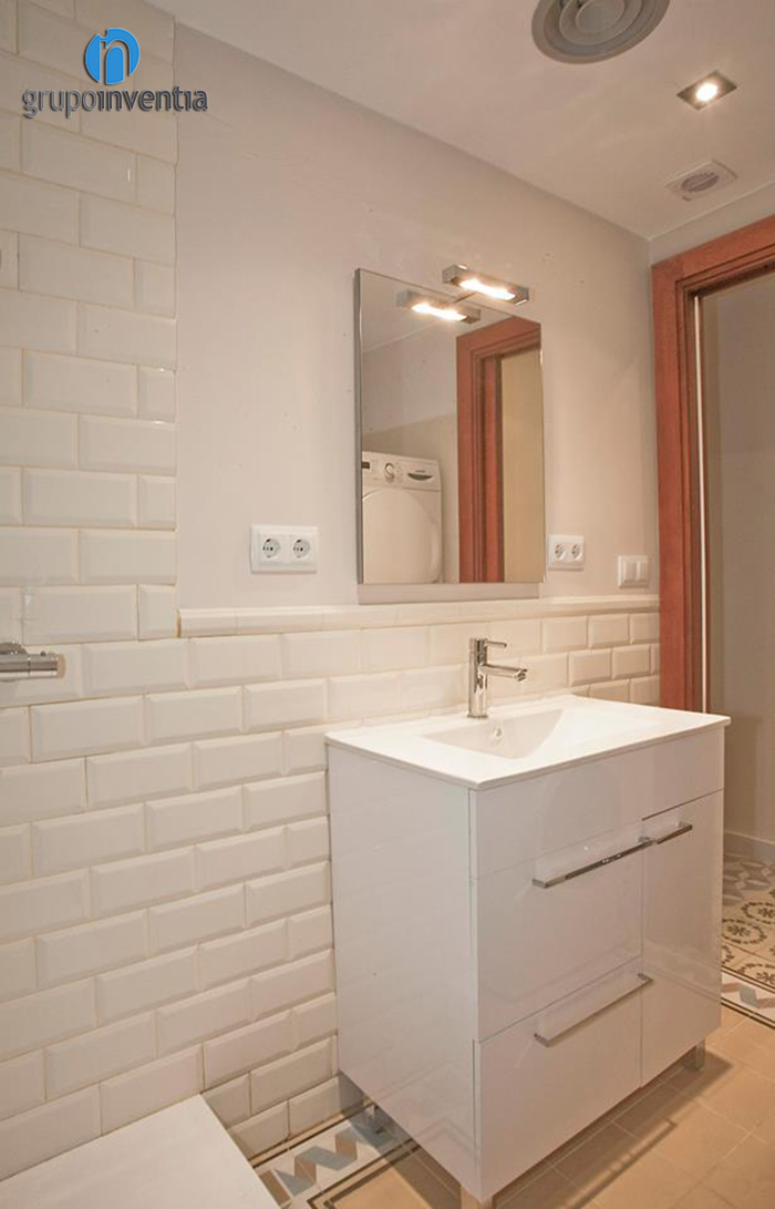 Pel que fa al disseny d’aquesta reforma de bany, les parets es van enrajolar fins a mitja alçada amb rajoles bisellades de color blanc i la resta de la paret es va pintar del mateix color. Això, combinat amb el paviment hidràulic genera major sensació d’amplitud i lluminositat a l’estança.