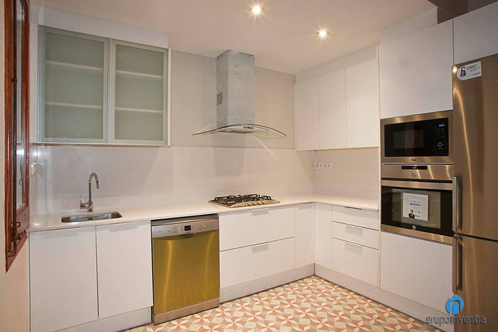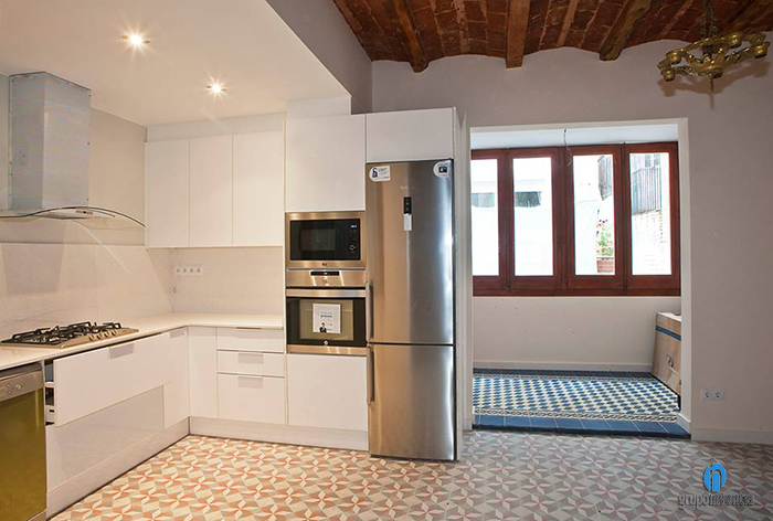 Es va tractar d’una reforma de cuina oberta en la qual es va utilitzar una distribució en forma de L. A l’extrem de la part dreta d’aquesta reforma de cuina es van col·locar els electrodomèstics, tots ells encastats i compostos per una nevera, un forn i un microones. Seguidament es va col·locar un petit tram de taulell perfecte per utilitzar-se com superfície de suport. A més, aquesta part de la cuina compta amb armaris i calaixos tant en la part inferior com a la superior del taulell.