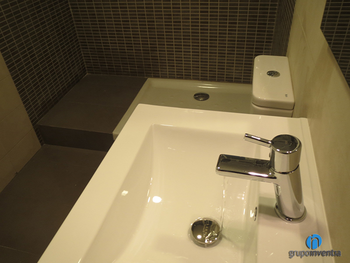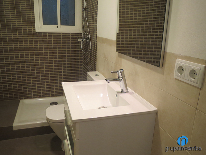 Pel que fa a la reforma de bany, es va aprofitar tot l’espai disponible per a aconseguir un espai pràctic i funcional sense restar mobilitat al seu usuari. En el renovat bany es va instal·lar un lavabo amb armari incorporat, un vàter i un plat de dutxa, les parets es van enrajolar amb rajoles de color beige fins a mitja alçada i un terra marronós que s’uneix amb el mosaic de la paret de la dutxa. Amb aquesta precisa combinació de colors, s’aconsegueix crear sensació d’amplitud i profunditat, fent del bany un lloc menys estret.