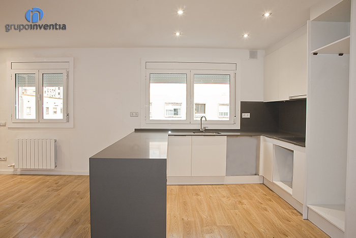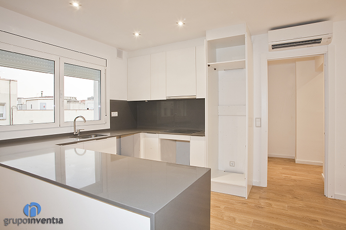La reforma de cuina és oberta al saló i per a la disposició dels seus elements es va utilitzar una distribució en forma d’U. A la part dreta es van disposar buits a mida per a col·locar la nevera, a l’extrem, i el forn, a la part baixa del primer tram de taulell. Sobre aquest es va instal·lar la placa vitroceràmica.