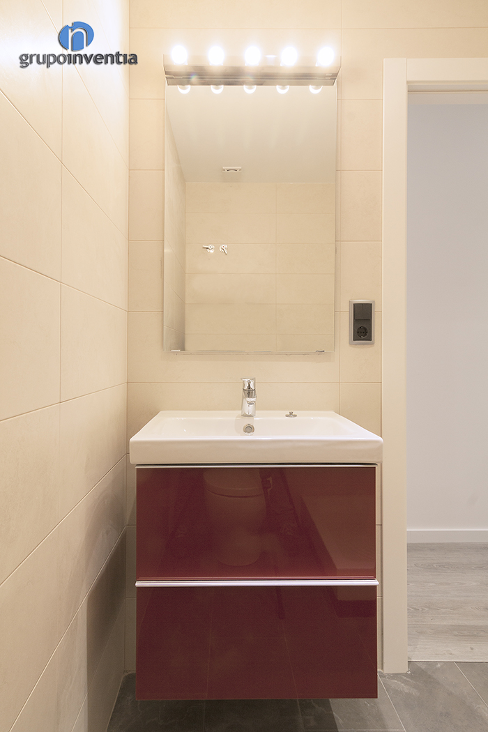 La nota de color intens d’aquest habitatge es troba precisament en la reforma de bany, ja que el moble del lavabo és de color vermell, aportant dinamisme.