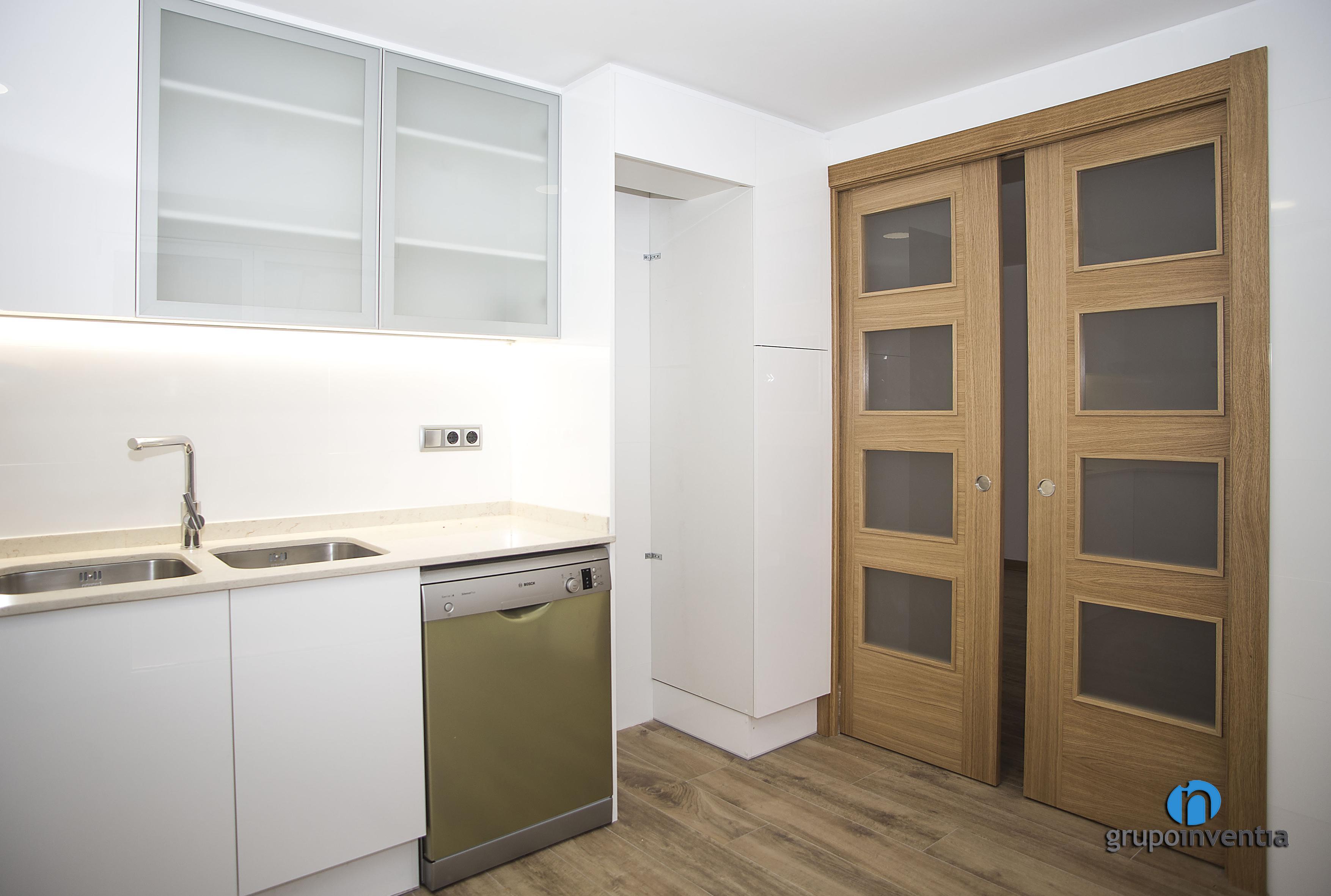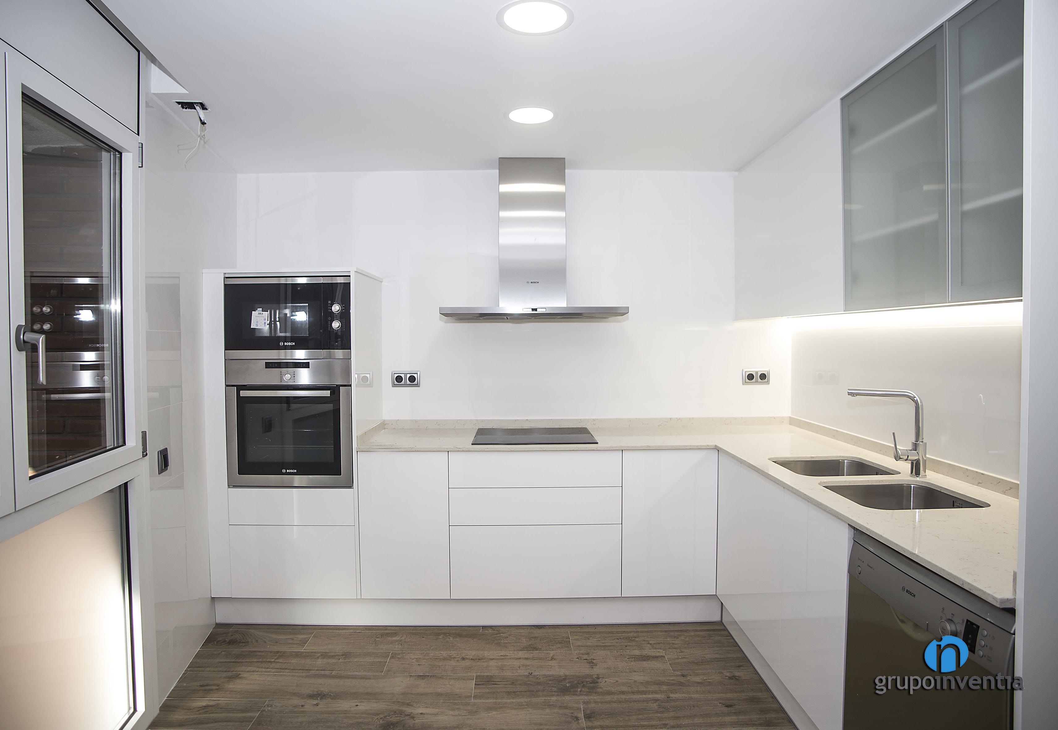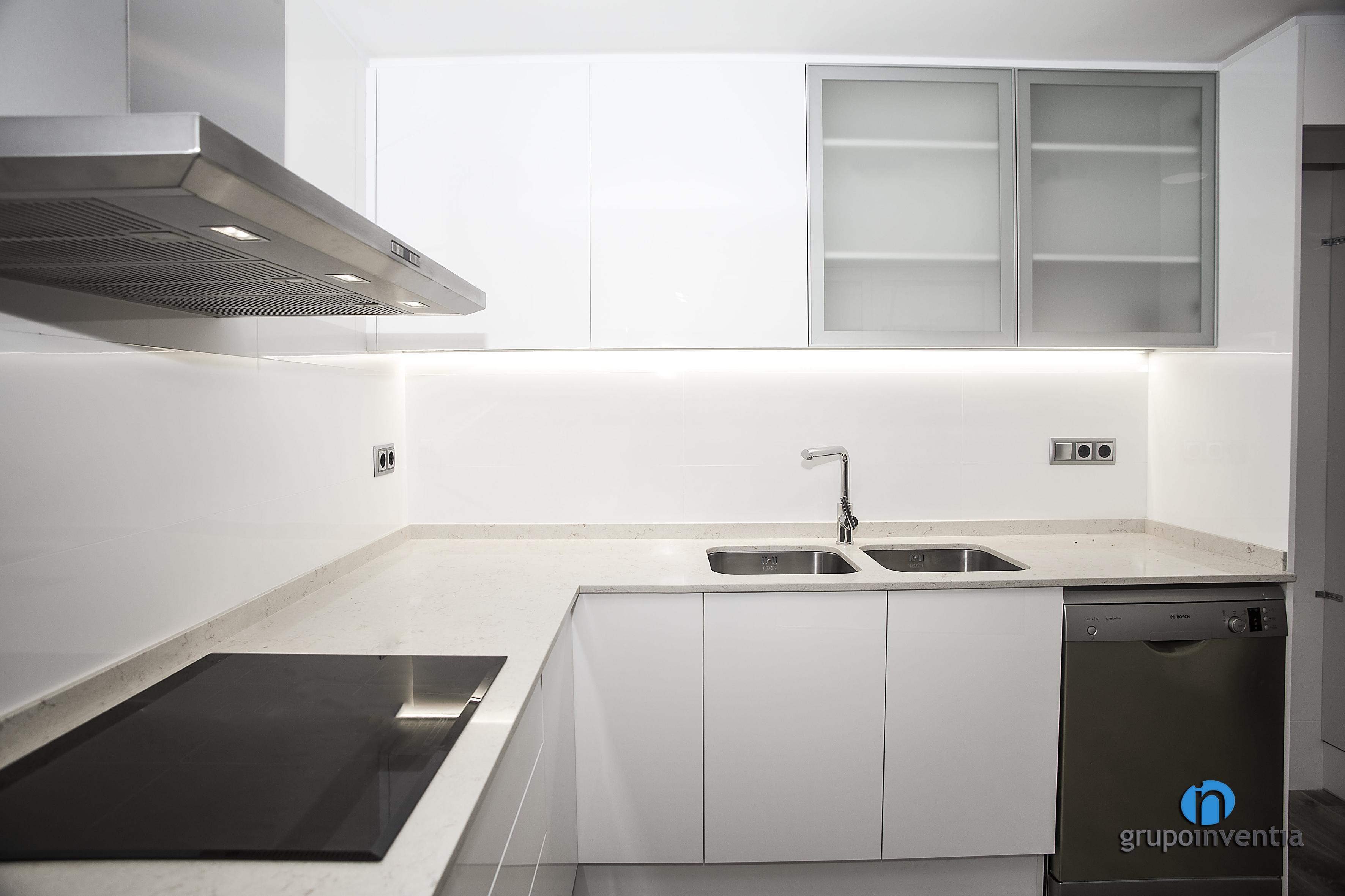 La cuina ocupa un espai independent de superfície quadrada. Per a la seva nova imatge es va utilitzar una distribució de cuina en forma de L. En l’extrem de la part dreta es va col·locar la nevera i tot seguit neix el primer tram de taulell. Sobre aquesta es va instal·lar una pica doble i en la seva part inferior es encastró el rentaplats.