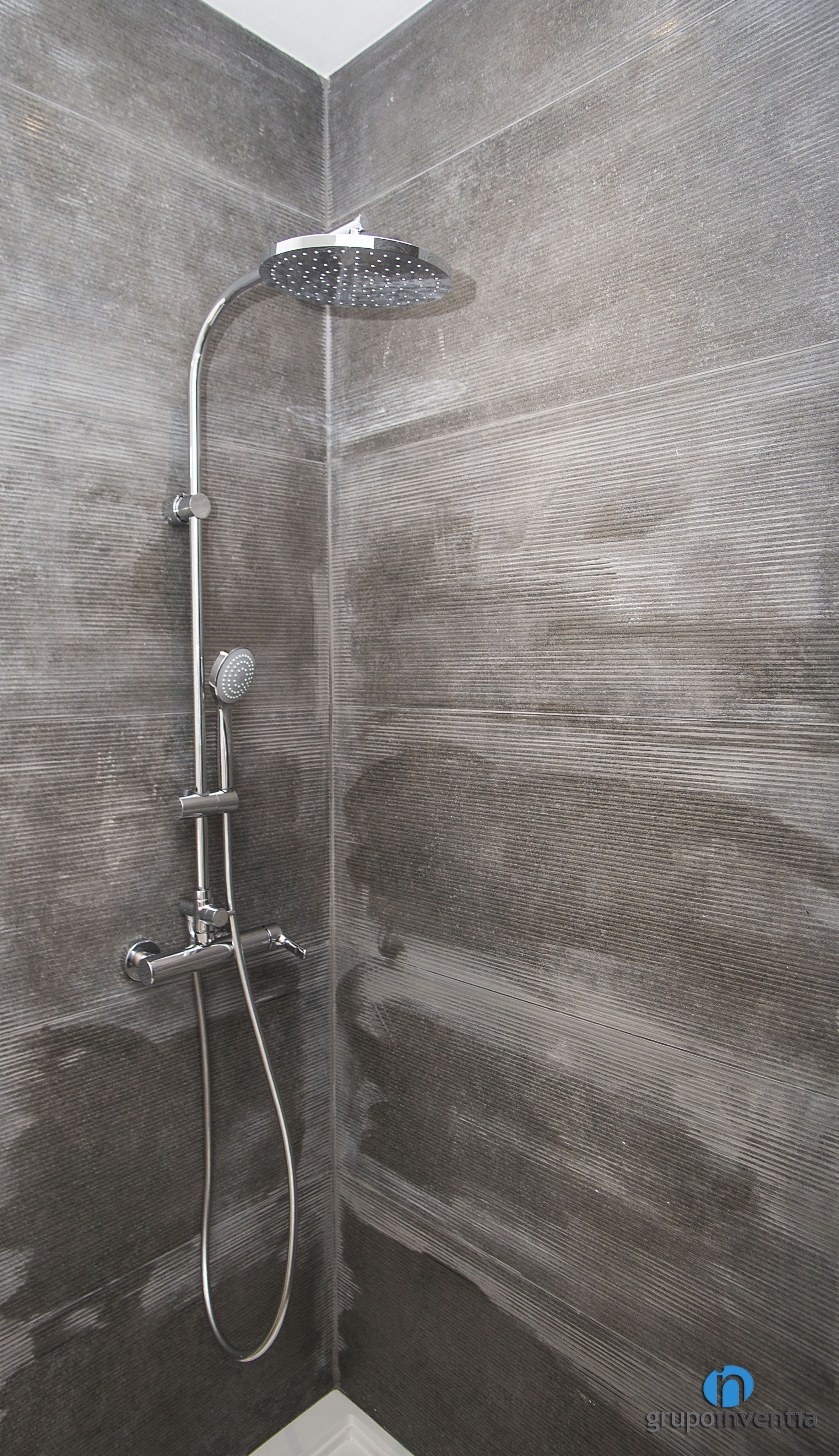 Pel que fa al disseny interior, les parets es van enrajolar a mitja alçada amb rajoles beige i es va pintar de blanc la resta. Destaca l’enrajolat de la dutxa, amb rajoles grises molt elegants.